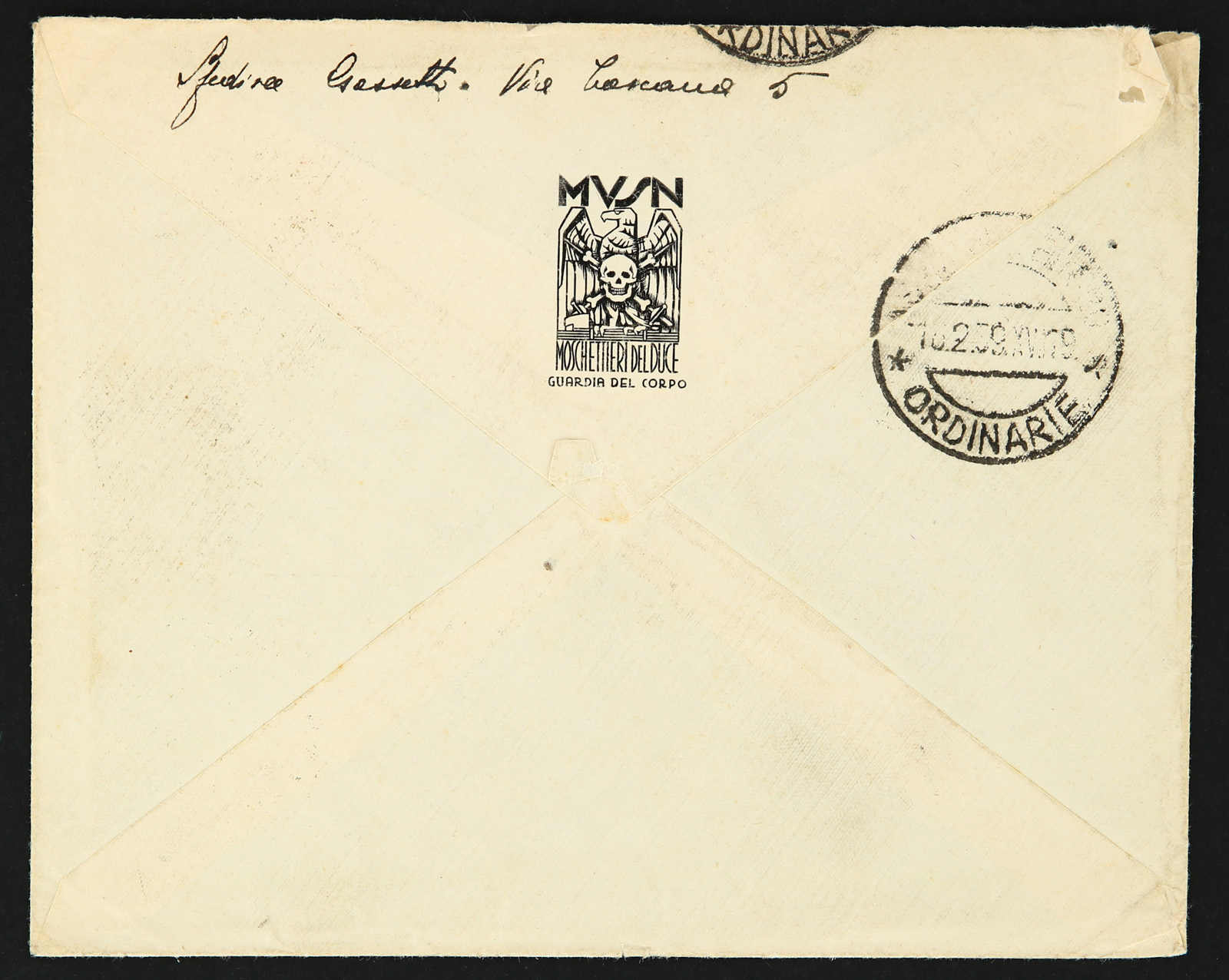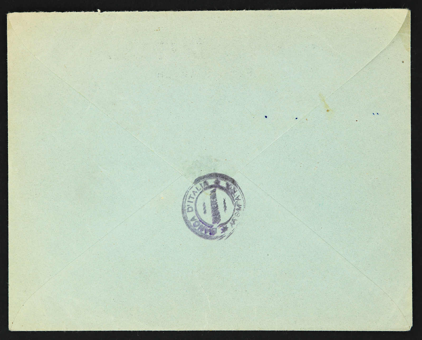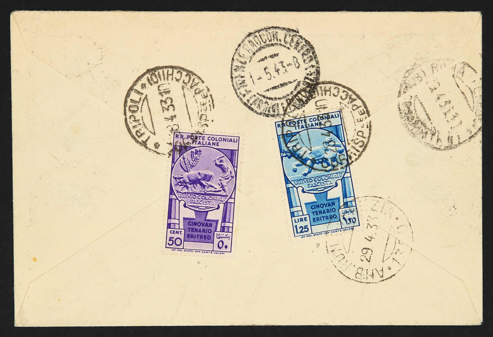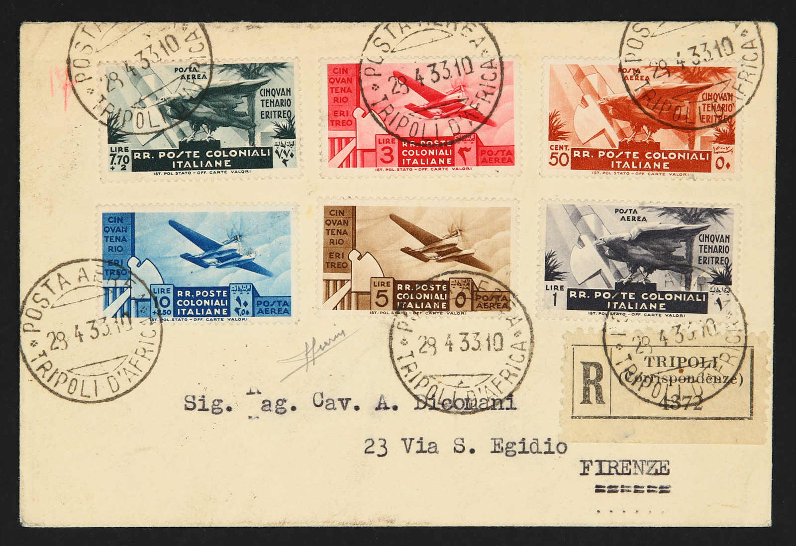 1933, registered cover sent from Tripoli with general colonies issue stamps to Firenze/Italy bearing on front airmail stamps and on reverse two commemorative stamps, all tied by "POSTE AEREA TRIPOLI D'AFRICA" postmarks (Sassone A15/20,