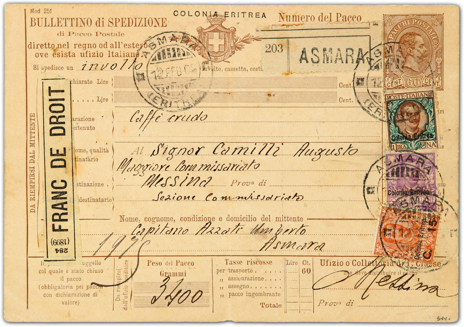 1905, parcel card of Eritrea 60 cen. used with additional Colonia Eritrea overprinted stamps 1 Lire, 50 cen and 15 cen, tied by "Asmara/Eritrea" postmarks, sent with parcel of 3400 gr. to Messina, Sassone 27, 30, 38 and Filigrano P.5 (Image) (imagea)