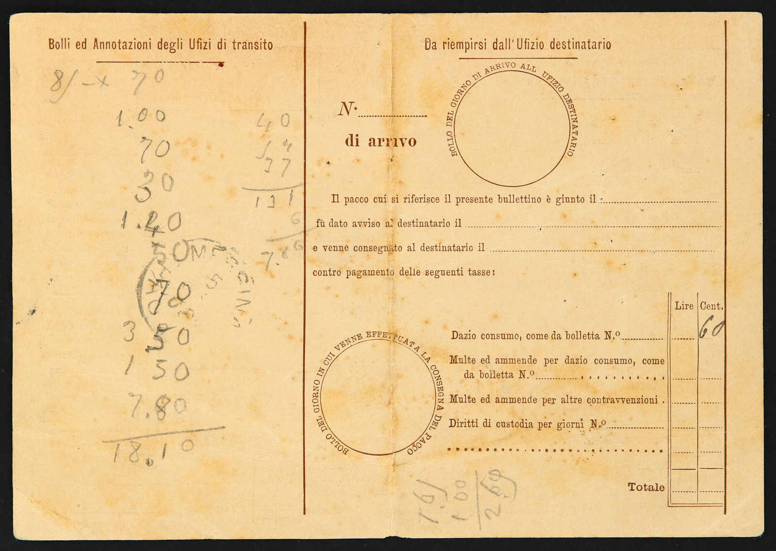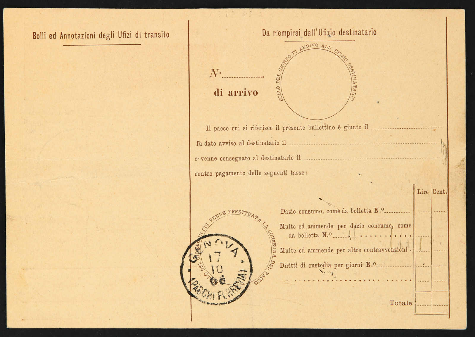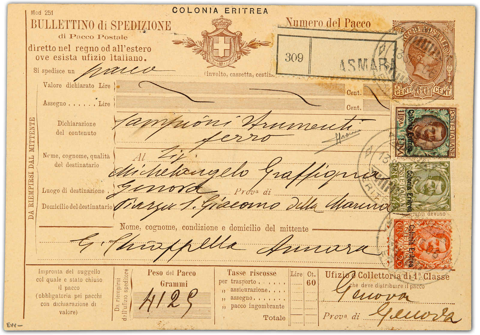 1906, parcel card of Eritrea 60 cen, used with additional Colonia Eritrea overprinted stamps 1 Lire, 45 cen, and 20 cen. tied by "Asmara/Eritrea" postmarks, sent with parcel of 4129 gr. to Genova, Sassone 23, 25, 28 and Filigrano P.5 (Image) (imagea)