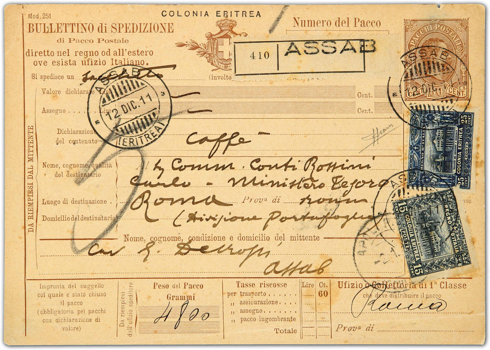 1911, parcel card of Eritrea 60 cen, used with additional Colonia Eritrea stamps 15 cen. and 25 cen. tied by "Assab/Eritrea'" postmarks, sent with parcel of 4800 gr. to Roma, Sassone 36, 37 and Filigrano P.5 (Image)