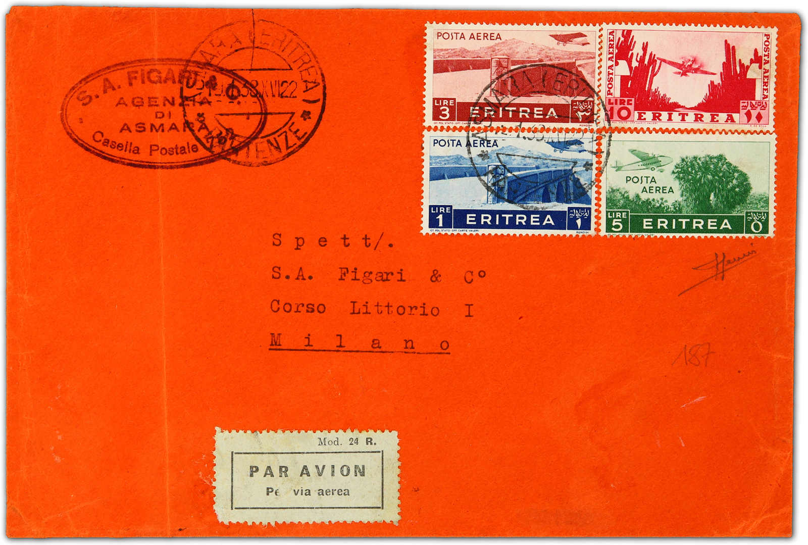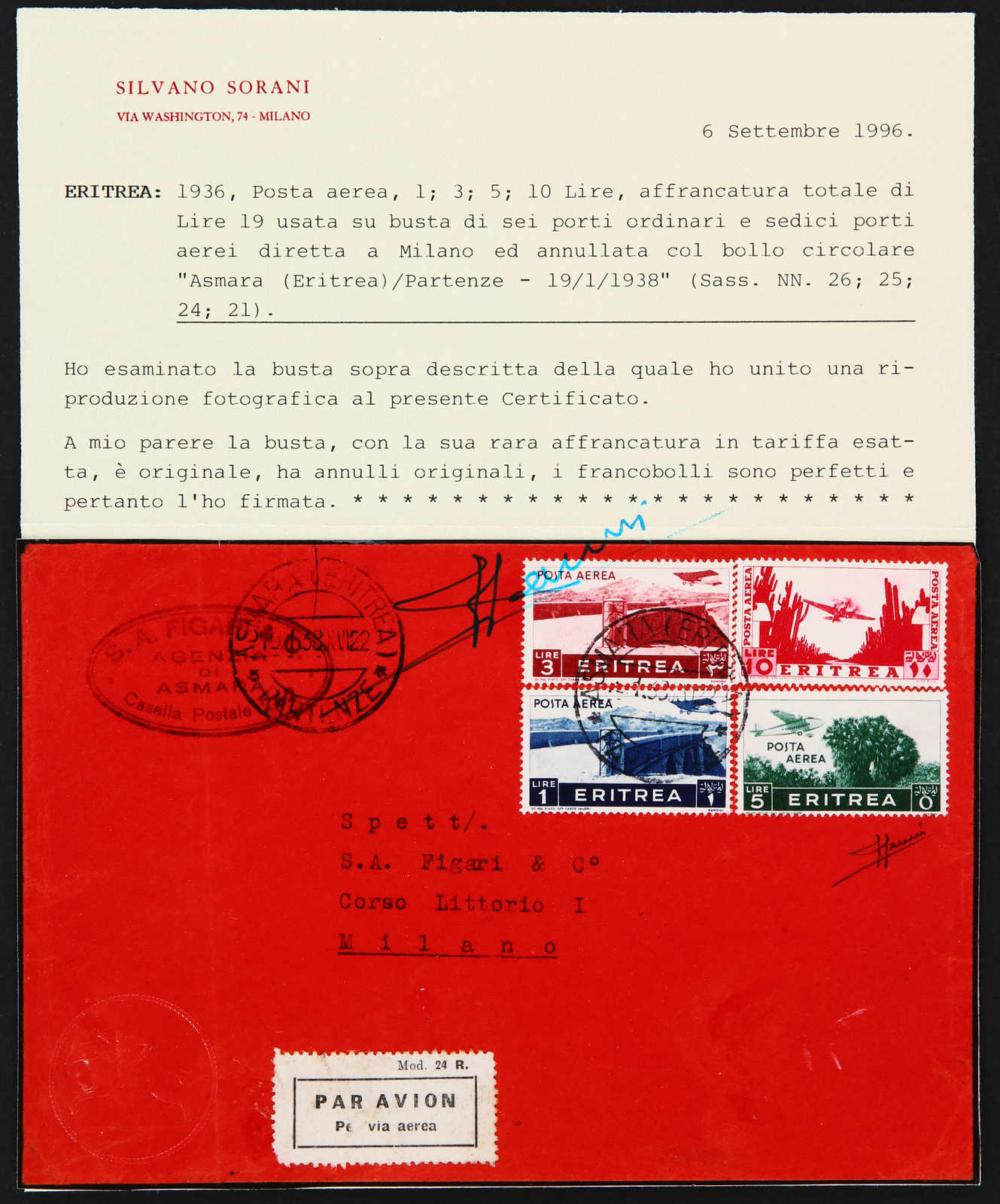 1938, airmail cover sent from Asmara to Milano bearing 1936 issue 1 Lire, 3 Lire, 5 Lire and 10 Lire, tied by "Asmara (Eritrea) /Partenze" postmark dated 19/1/1938, Sassone 21, 24, 25 and 26, cat. 3200 €, certificate Sorani (Image) (imagea)
