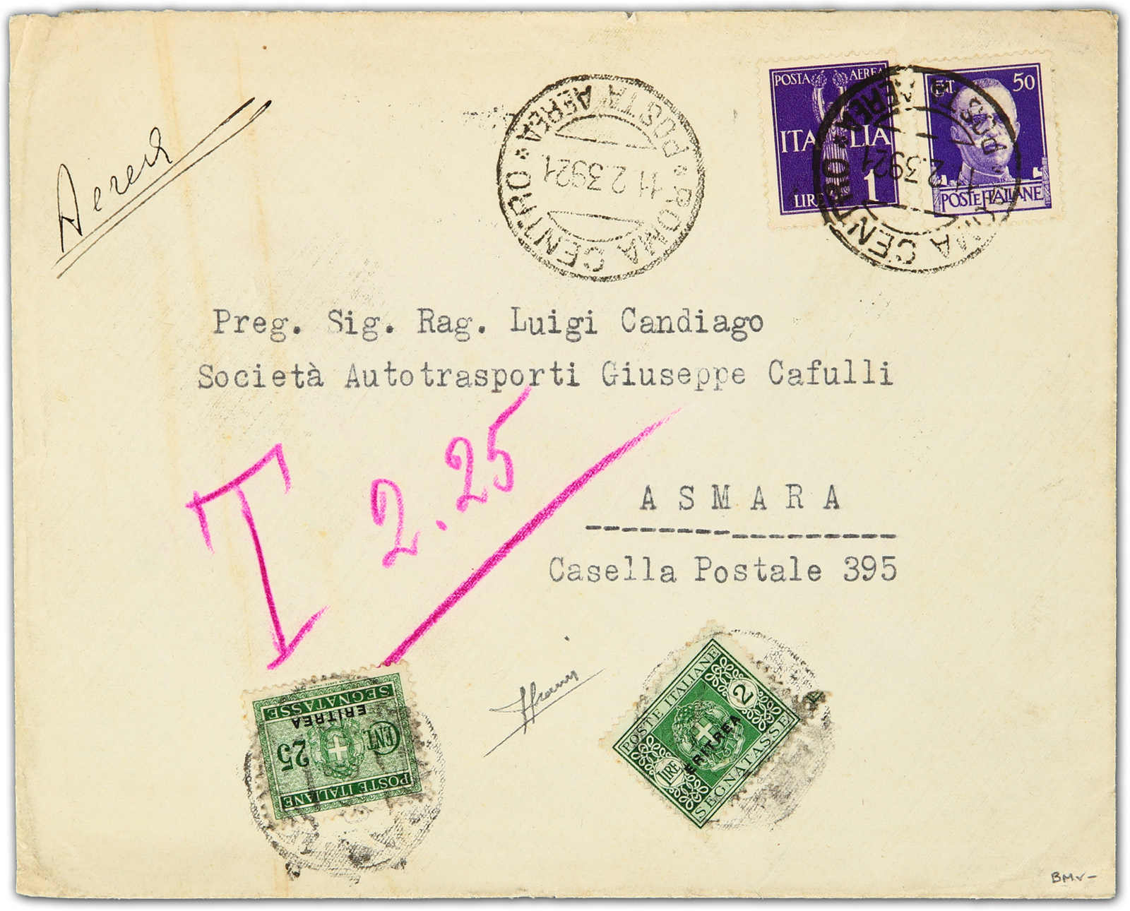 1939, airmail cover sent from Roma with 1 lire and 50 cent tied by "Roma Centro/Posta Aerea" postmark dated 11/2/39, alongside in handwriting "T.2.25", the missing fee collected in Asmara by postage due with Eritrea overprinted stamps of