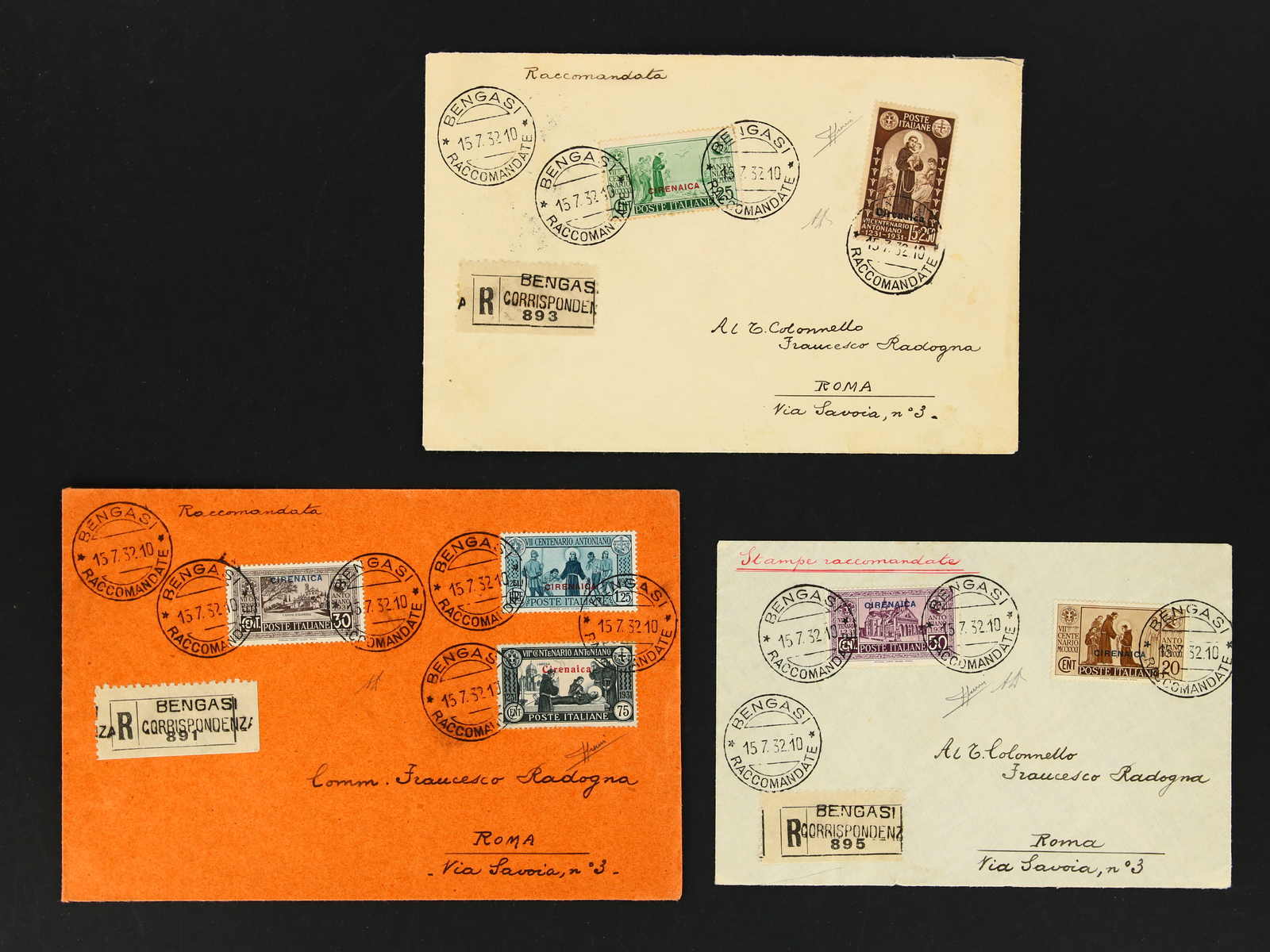 1932, Cirenaica S.Antonio, full set on three registered covers sent from Bengasi to Roma, Sassone 86-92, cat. 825 € (Image) (imagea)