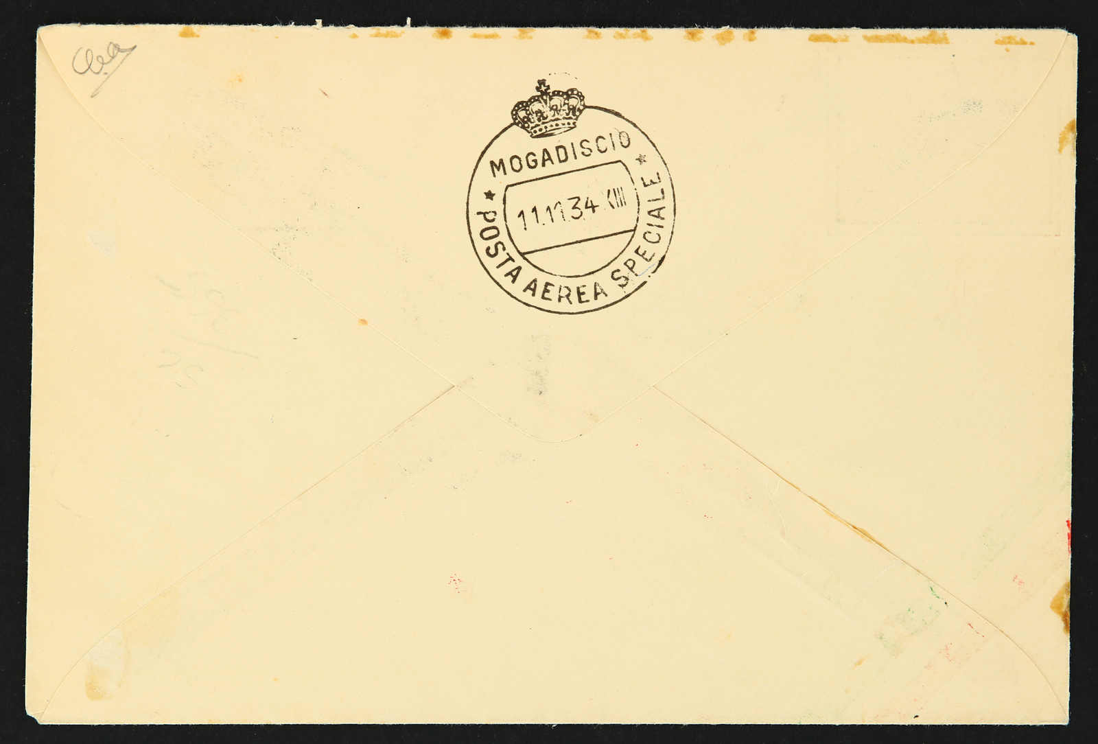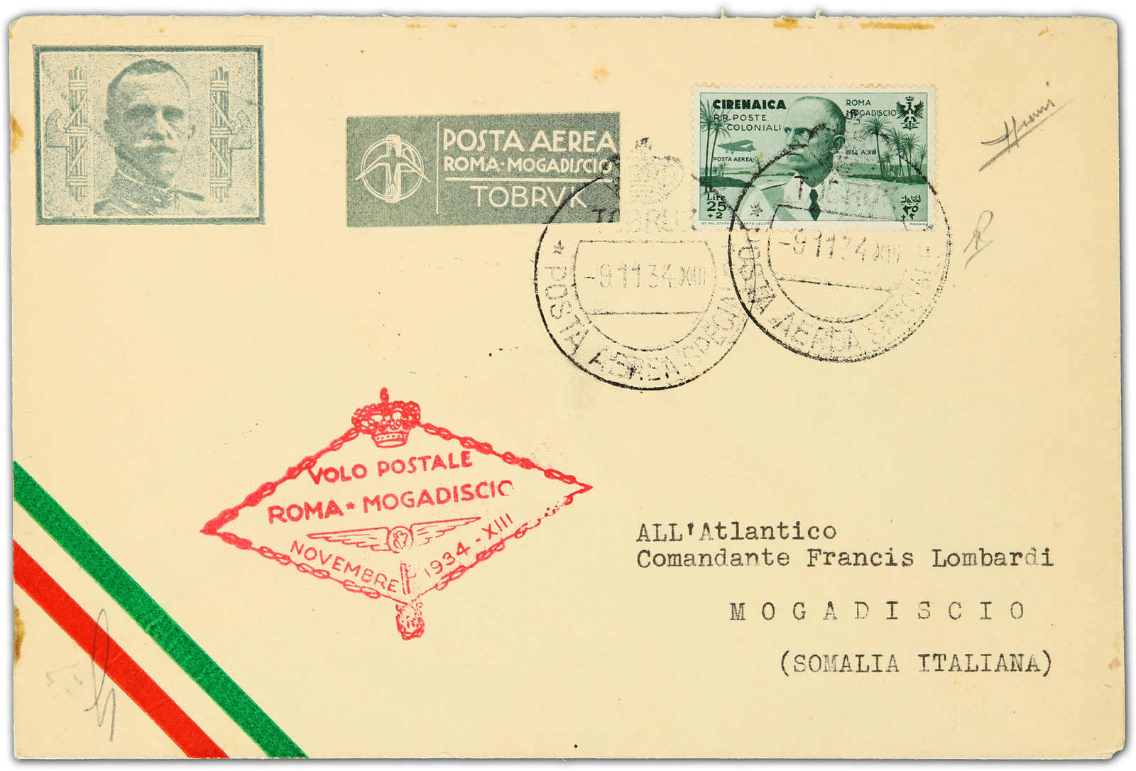 1934, Cirenaica special first fly cover from Tobrukvia Roma to Magadiscio bearing single franking 25 Lire tied by Tobruk postmark dated 9.11.34, alongside large size red "Volo Postale Roma-Mogadiscio November 1934-XIII" cachet, Sassone