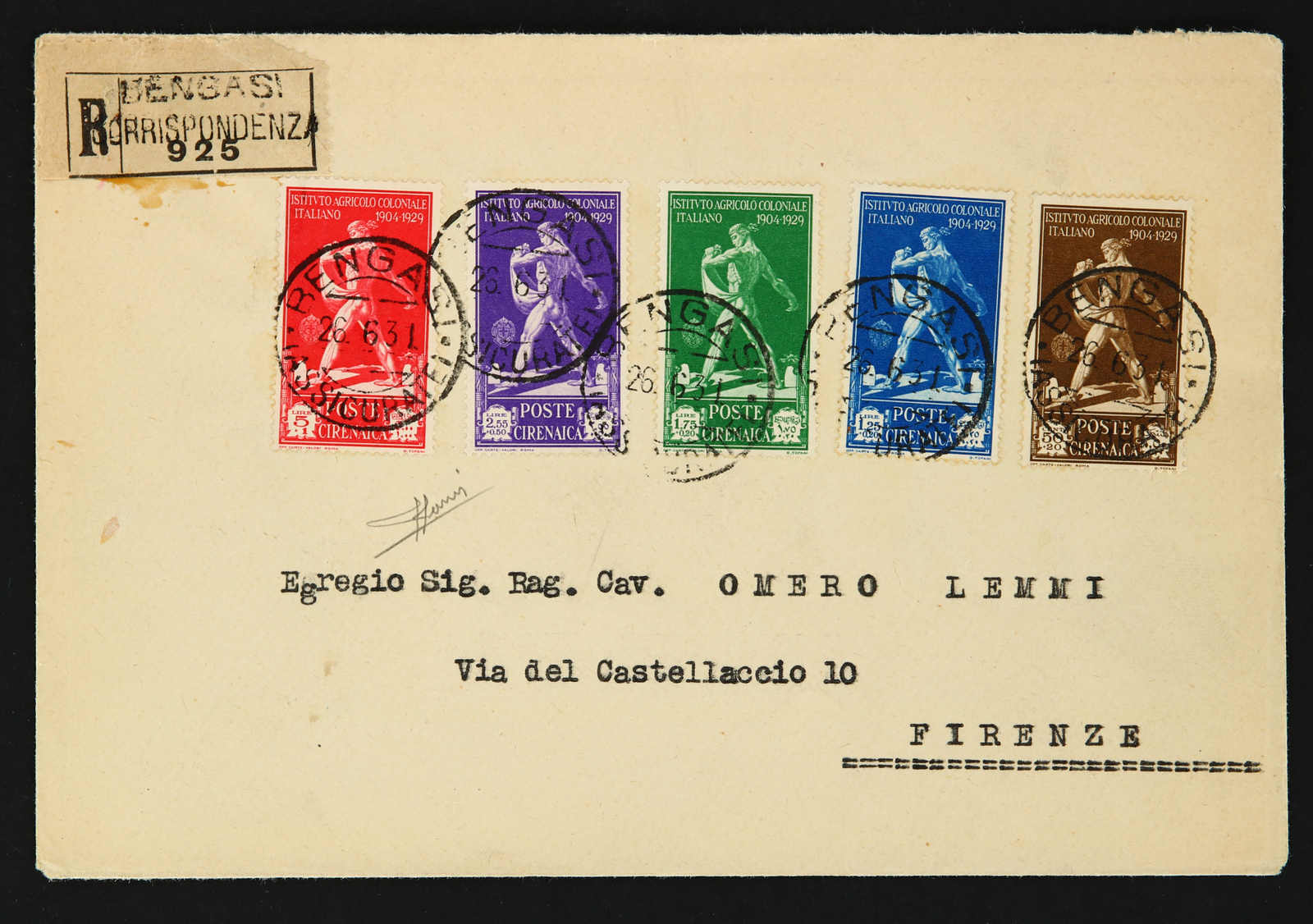 1931, Cirenaica Pro Istituto Agricolo, full set on registered cover sent from Bengasi to Firenze, Sassone 72-76, cat. 600 € (Image) (imagea)