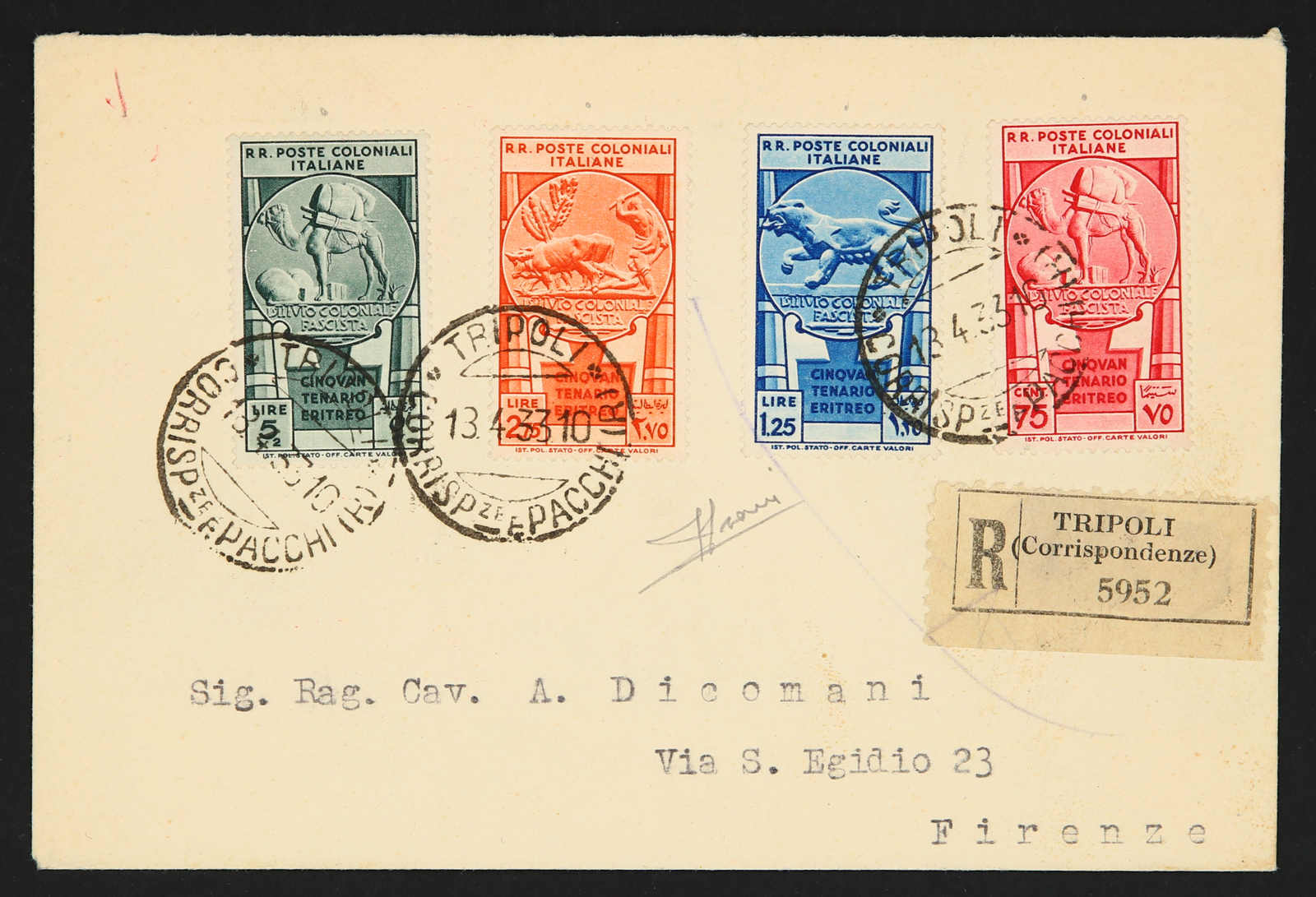 1933, registered cover sent from Tripoli with general Colonies issue stamps to Firenze/Italy bearing Cinquantenario Eritrea issue 75 cen., 1,25 lire, 2,75 Lire and 5 lire tied by "TRIPOLI CORRISPZE PACCHI R" postmarks, alongside