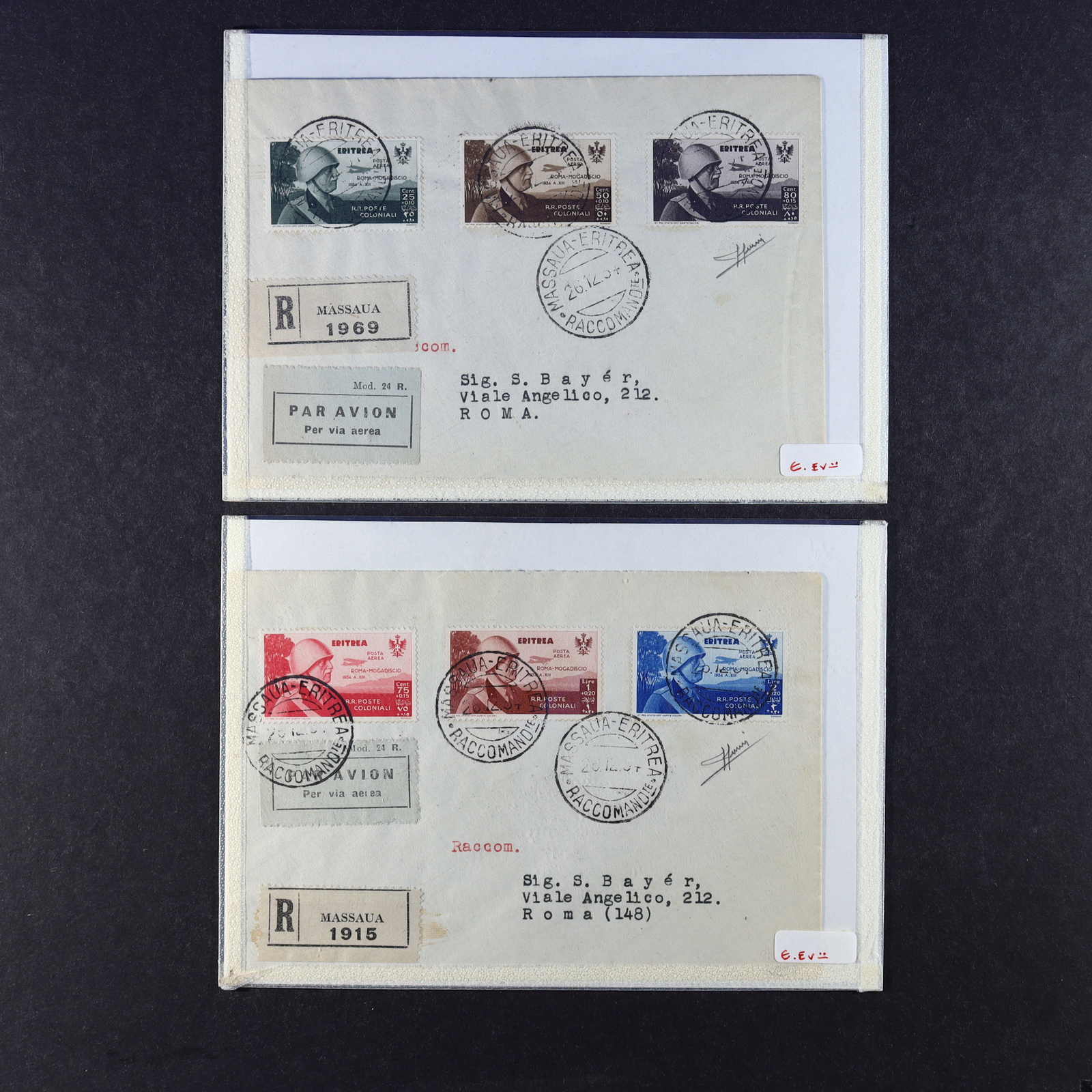 1935, two registered covers sent from Massaua to Roma bearing second airmail issue first six stamps tied by "MASSAUA-ERITREA RECCOMANDE" postmarks (Sassone A 7/12) (Image)