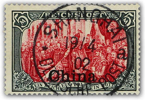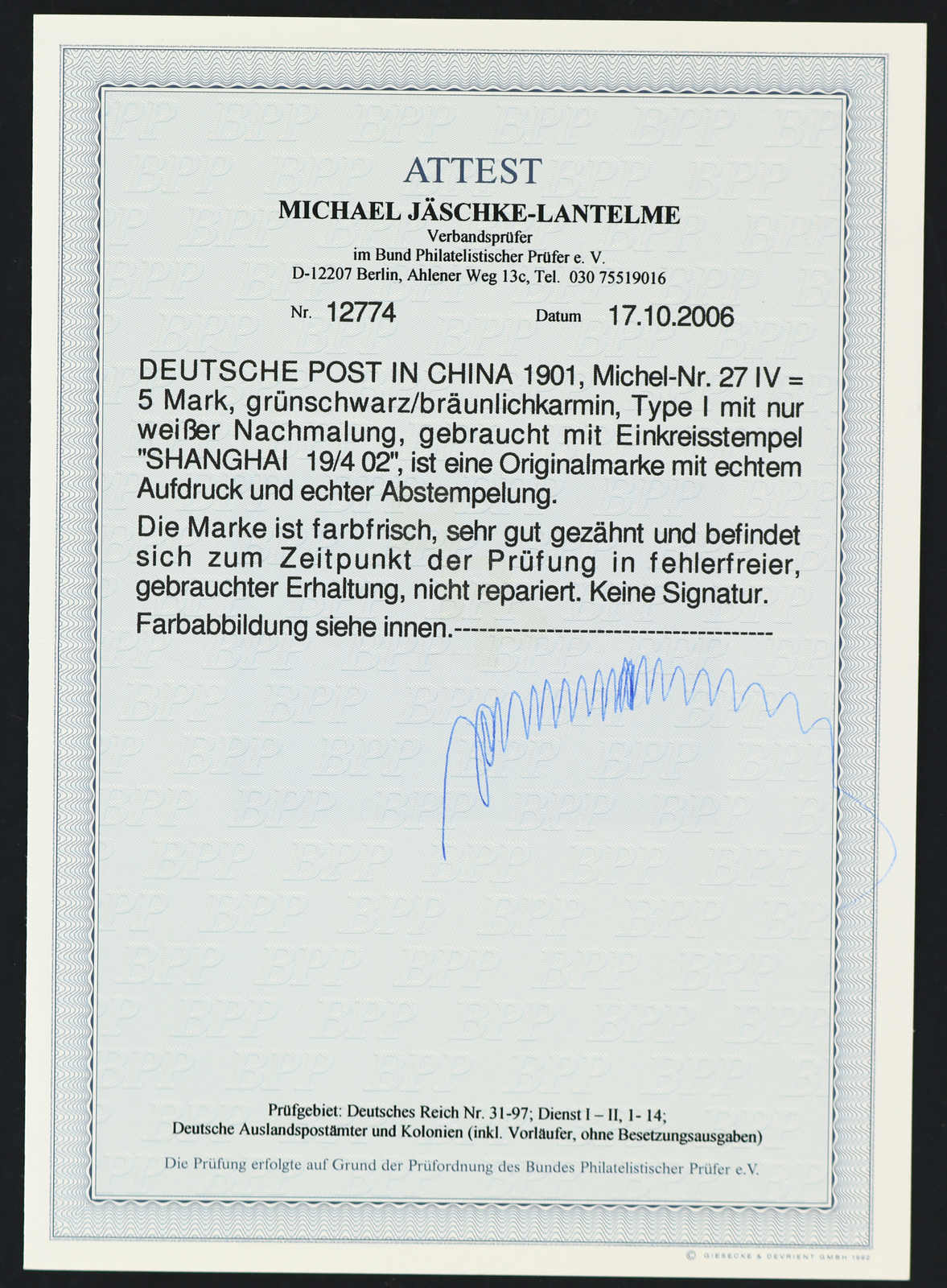 1901, 5 M. Aufdruckausgabe grünschwarz/bräunlichkarmin, Type I mit Nachmalung nur in Deckweiß, klar gestempelt "SHANGHAI 19/4 02", farbfrisch, einwandfrei, Fotoattest Jäschke-Lantelme BPP (ME 800,-) (Image) (imagea)