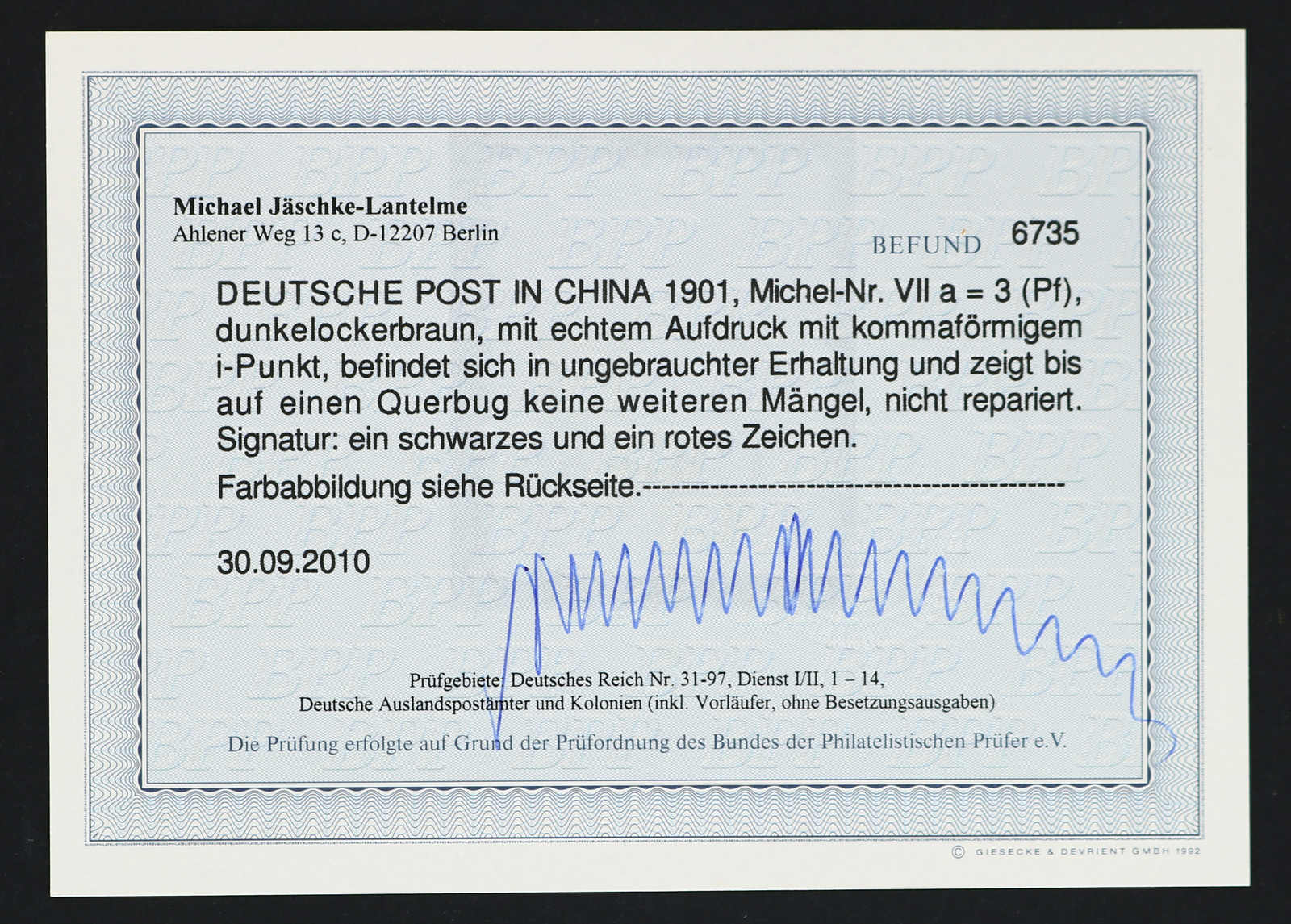 1901, 3 Pfg. dunkelockerbraun, nicht ausgegebener Wert mit Aufdruck mit kommaförmigem i-Punkt, ungebraucht, Querbug, signiert, Fotobefund Jäschke-Lantelme BPP (Image) (imagea)