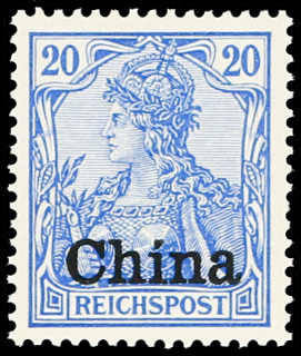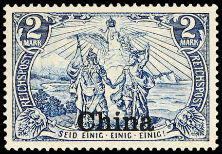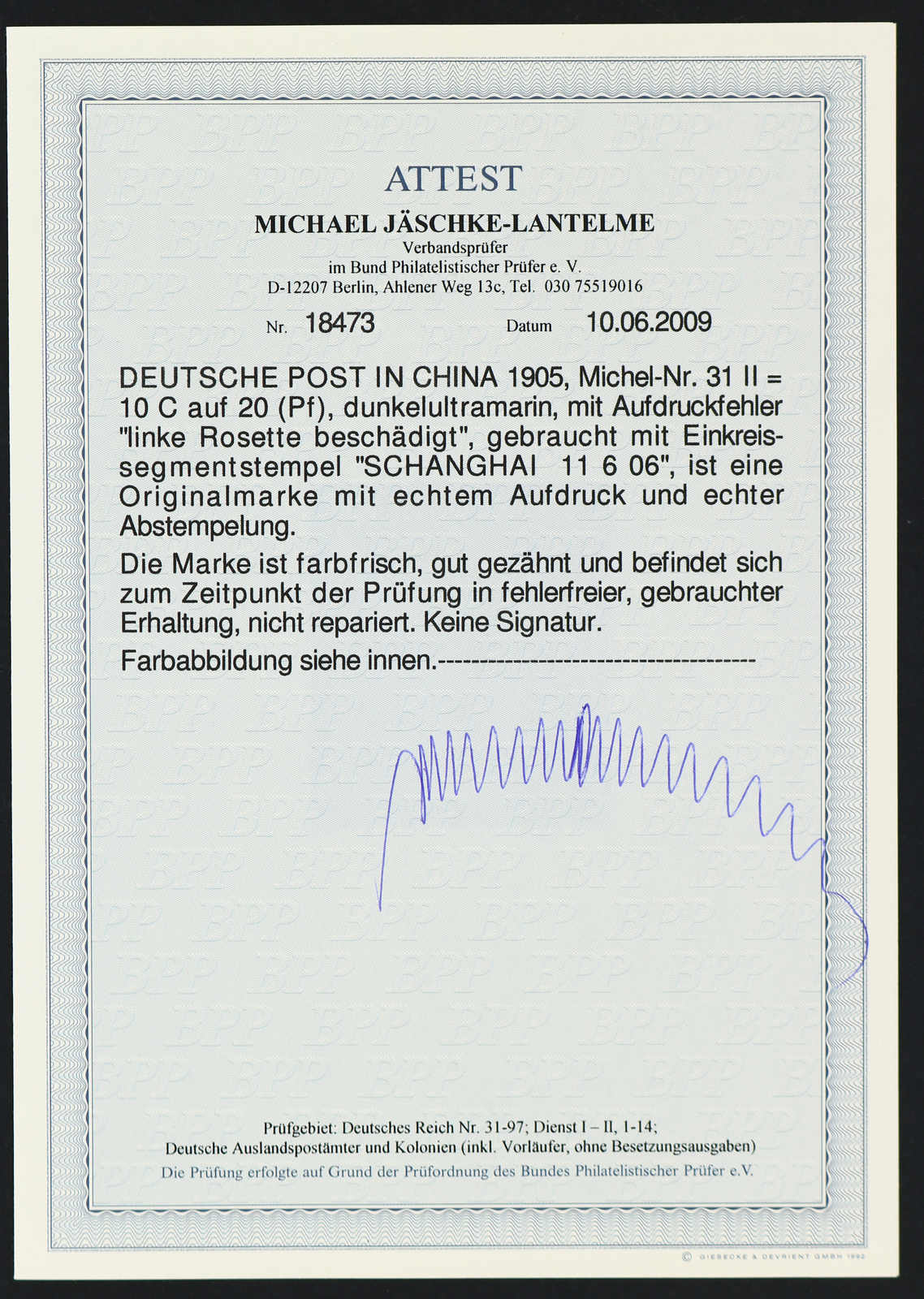 1905, 10 C. auf 20 Pfg. Aufdruckausgabe dunkelultramarin, mit Aufdruckfehler "linke Rosette beschädigt", sauber gestempelt "SCHANGHAI 11 6 06", farbfrisch, einwandfrei, Fotoattest Jäschke-Lantelme BPP (ME 1.500,-) (Image) (imagea)