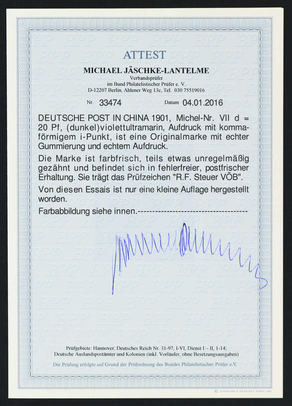 1901, 20 Pfg. (dunkel)violettultramarin, nicht ausgegebener Wert mit Aufdruck mit kommaförmigem i-Punkt, POSTFRISCH, etwas unregelmäßig gezähnt, sonst einwandfrei, signiert Steuer VÖB, Fotoattest Jäschke-Lantelme BPP (Image) (imagea)