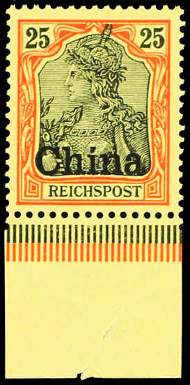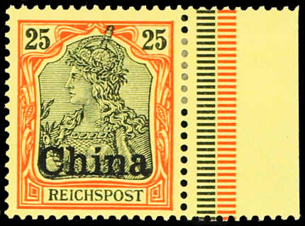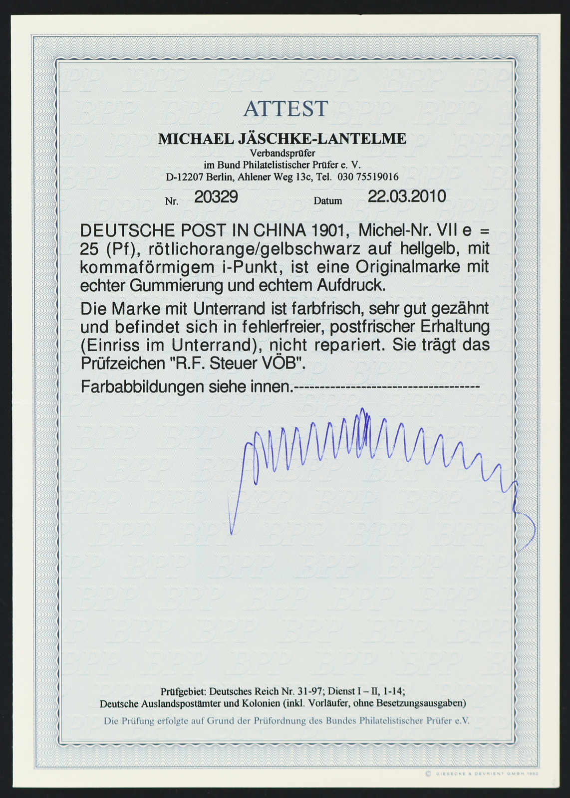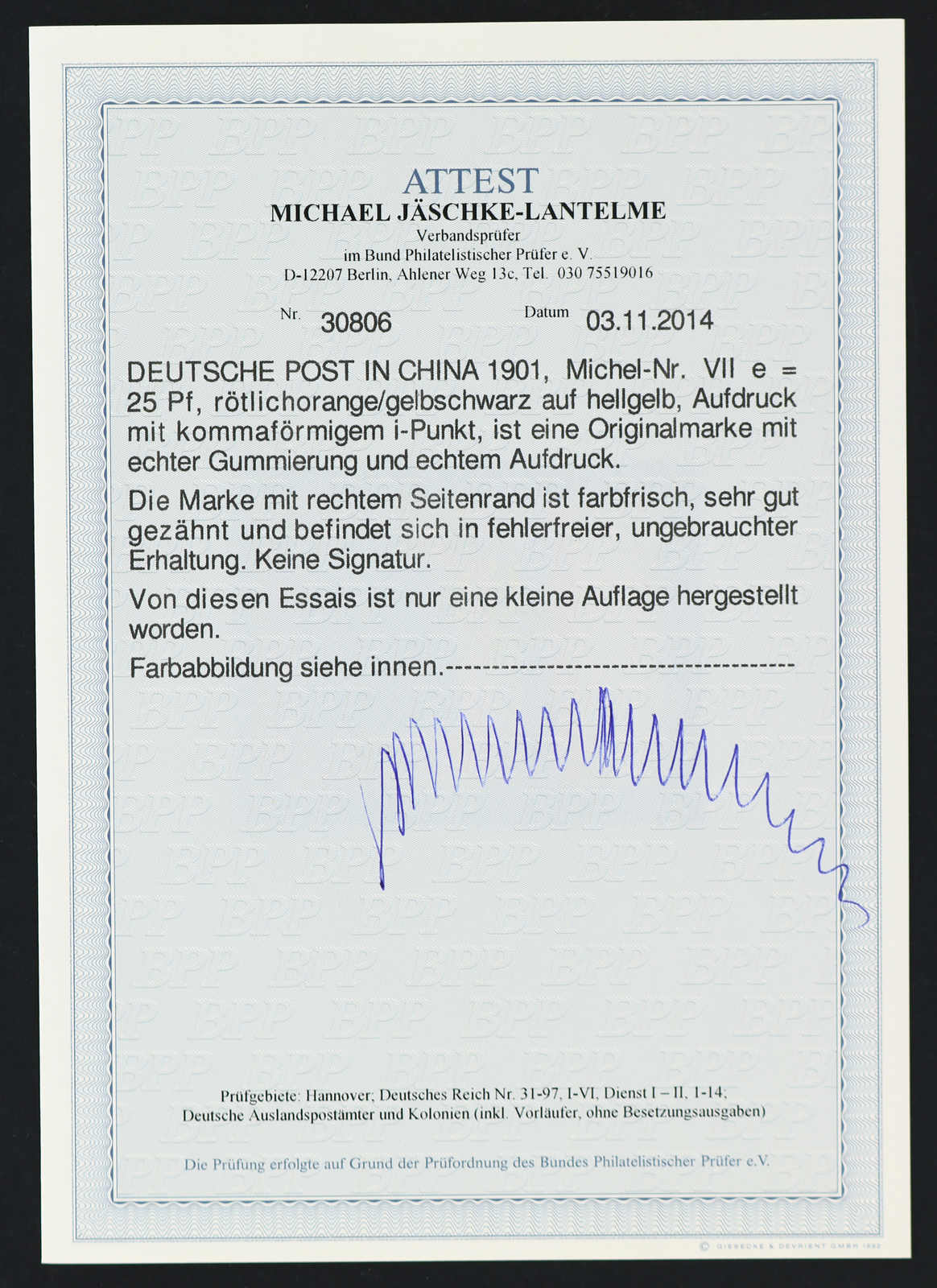 1901, 25 Pfg. rötlichorange/gelbschwarz auf hellgelb, nicht ausgegebener Wert mit Aufdruck mit kommaförmigem i-Punkt vom rechten Bogenrand, ungebraucht, einwandfrei, Fotoattest Jäschke-Lantelme BPP (Image) (imagea)