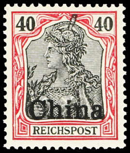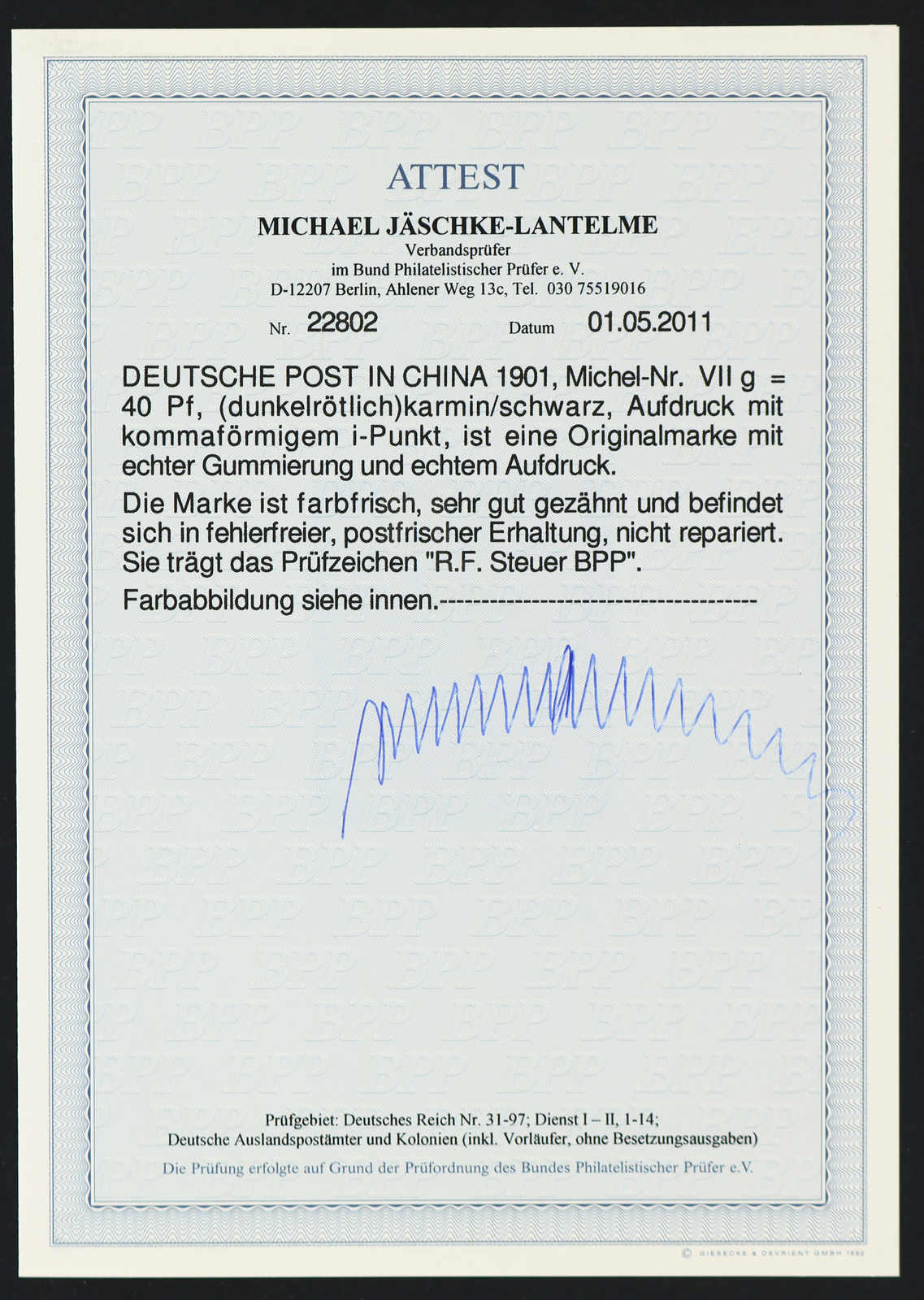 1901, 40 Pfg. (dunkelrötlich)karmin/schwarz, nicht ausgegebener Wert mit Aufdruck mit kommaförmigem i-Punkt, ungebraucht, einwandfrei, signiert Bothe BPP