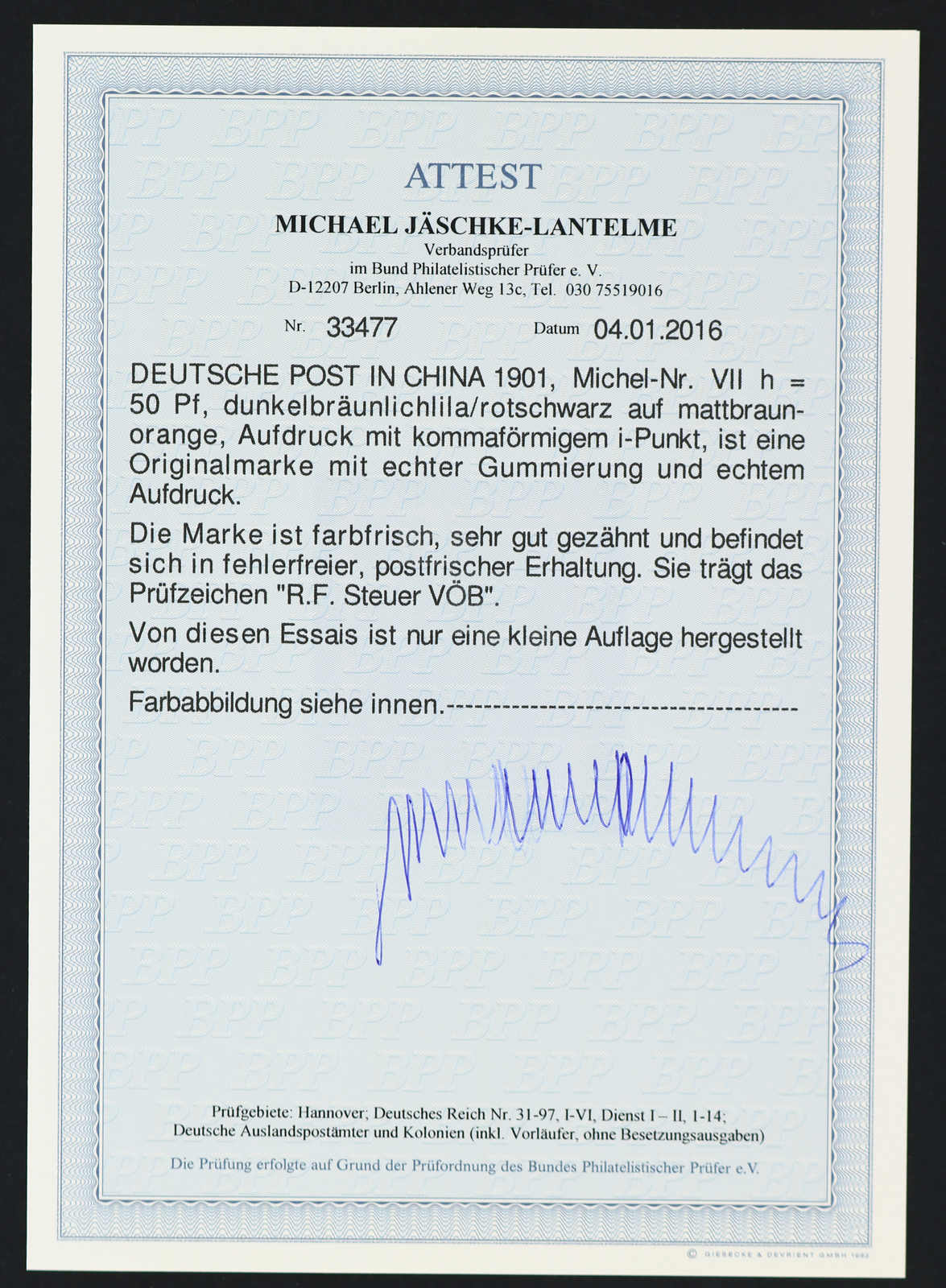 1901, 50 Pfg. dunkelbräunlichlila/rotschwarz auf mattbraunorange, nicht ausgegebener Wert mit Aufdruck mit kommaförmigem i-Punkt, POSTFRISCH, einwandfrei, signiert Steuer VÖB, Fotoattest Jäschke-Lantelme BPP (Image) (imagea)