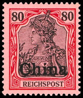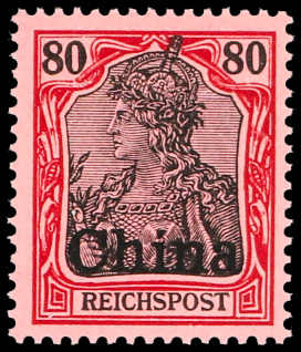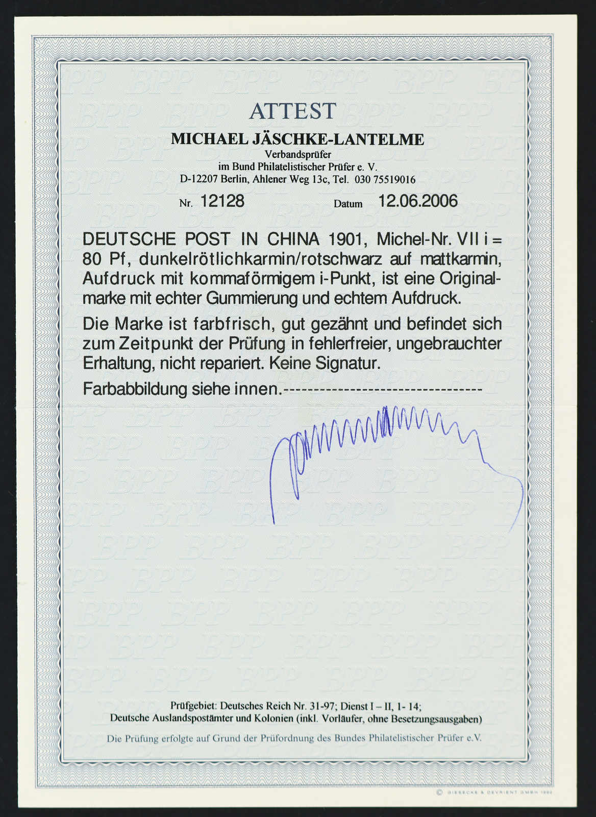 1901, 80 Pfg. dunkelrötlichkarmin/rotschwarz auf mattkarmin, nicht ausgegebener Wert mit Aufdruck mit kommaförmigem i-Punkt, ungebraucht, einwandfrei, Fotoattest Jäschke-Lantelme BPP (Image) (imagea)