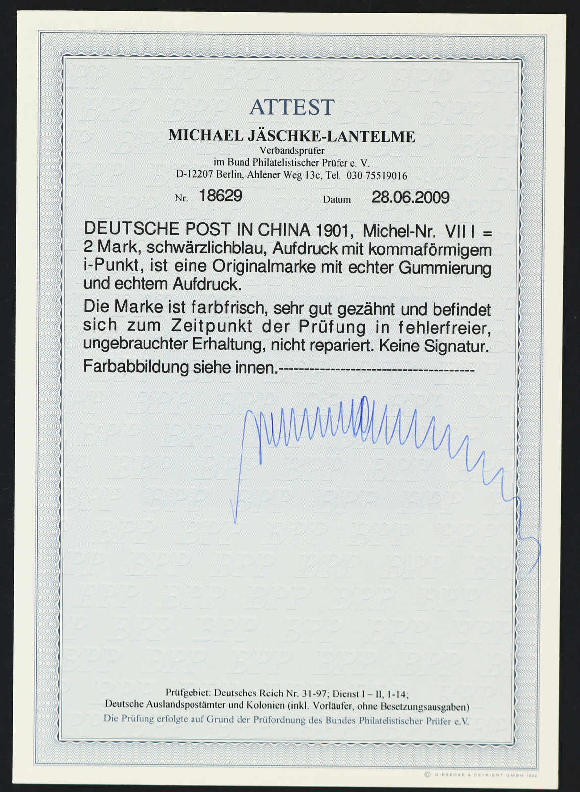 1901, 2 M. schwärzlichblau, nicht ausgegebener Wert mit Aufdruck mit kommaförmigem i-Punkt, ungebraucht, einwandfrei, Fotoattest Jäschke-Lantelme BPP