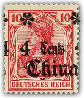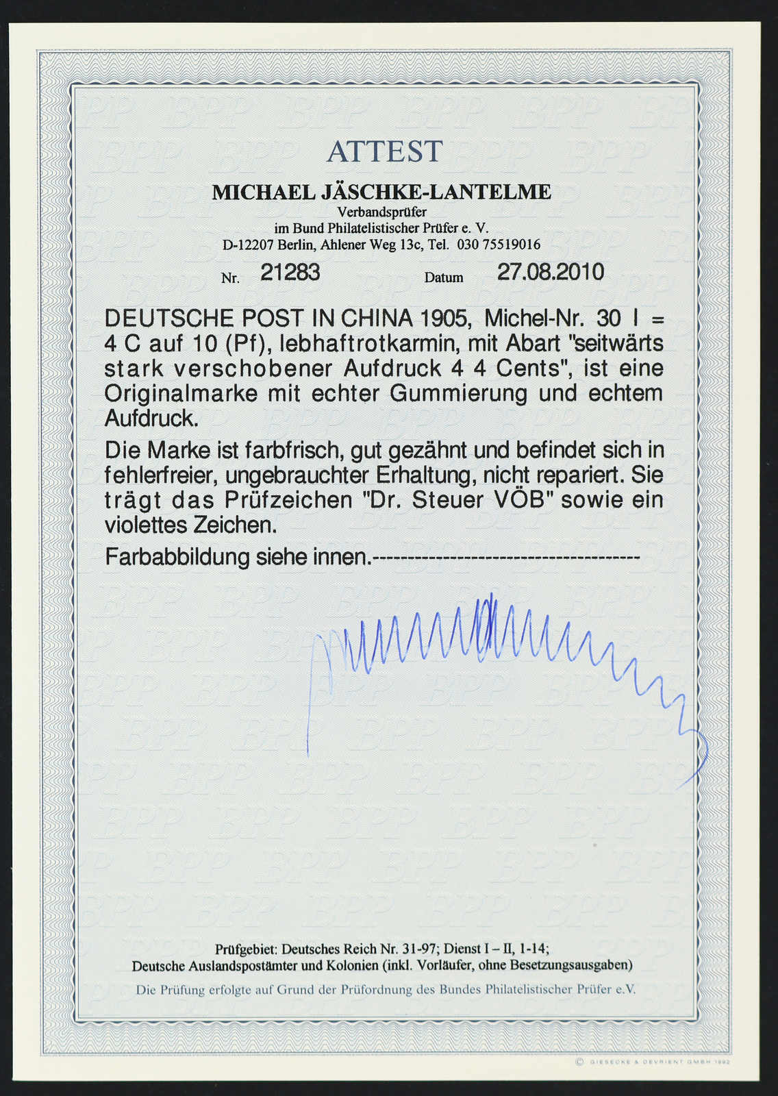 1905, 4 C. auf 10 Pfg. Aufdruckausgabe lebhaftrotkarmin, mit Abart "seitwärts stark verschobener Aufdruck 4 4 Cents", ungebraucht, farbfrisch, einwandfrei, signiert, Fotoattest Jäschke-Lantelme BPP (ME 3.000,-) (Image) (imagea)