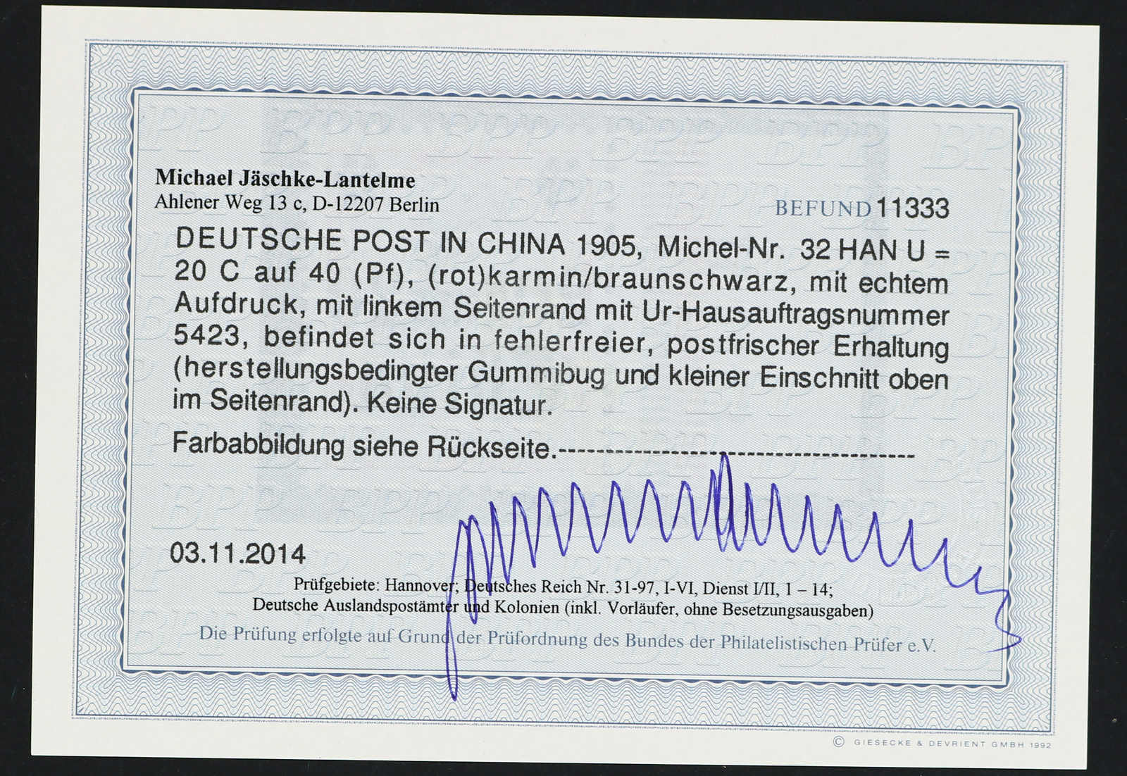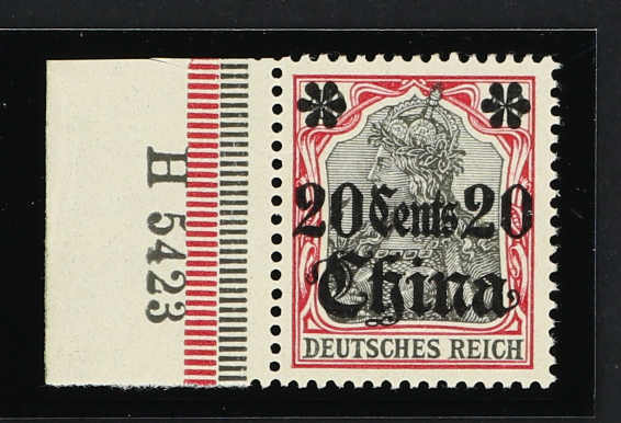 1905, 20 C. auf 40 Pfg. Aufdruckausgabe (rot)karmin/braunschwarz, postfrisches Exemplar vom linken Bogenrand mit Ur-HAN 5423, kleiner Einschnitt im Bogenrand, herstellungsbedingter Gummibug, einwandfrei, Fotobefund Jäschke-Lantelme BPP