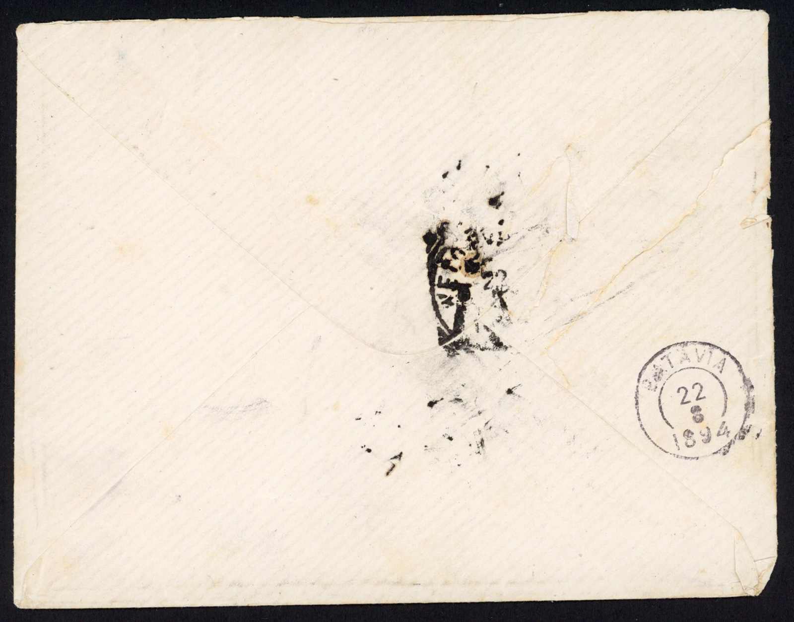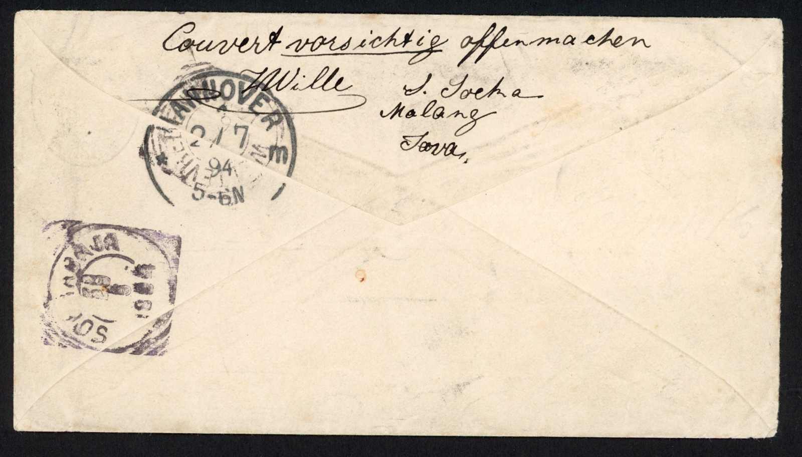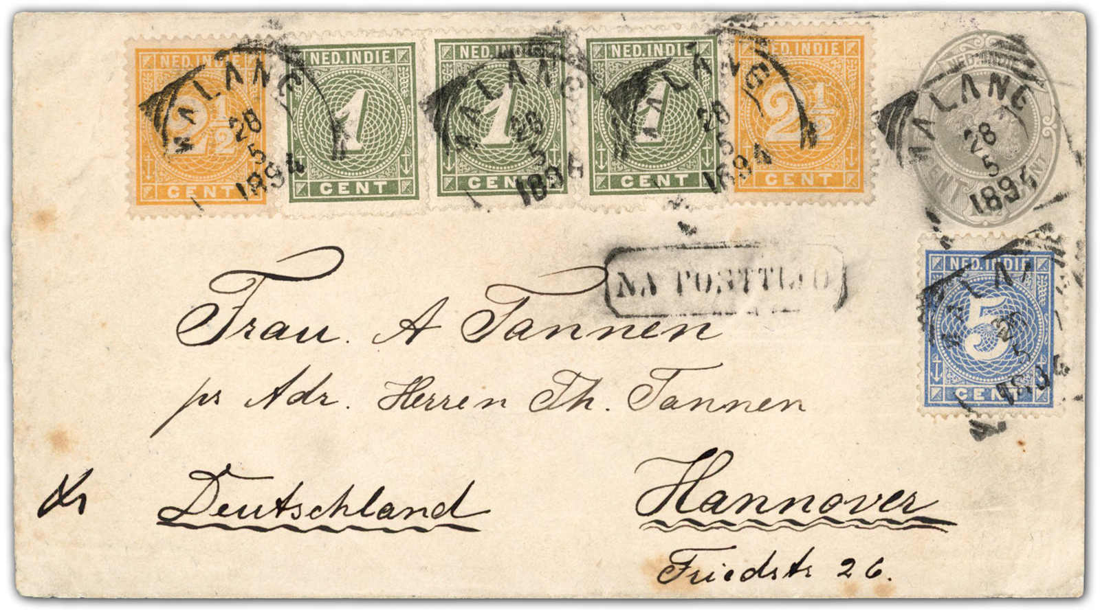 1894, 12½ C. Ganzsachenumschlag mit Zusatzfrankatur 1 (3), 2 1/2 (2) und 5 C. Ziffer ab "MALANG 28 5 1894" nach Hannover, nebengesetzt Ra1 "NA POSTTIJD", Ankunft 2.7.94, etwas fleckig, dennoch attraktiver Beleg (Image) (imagea)