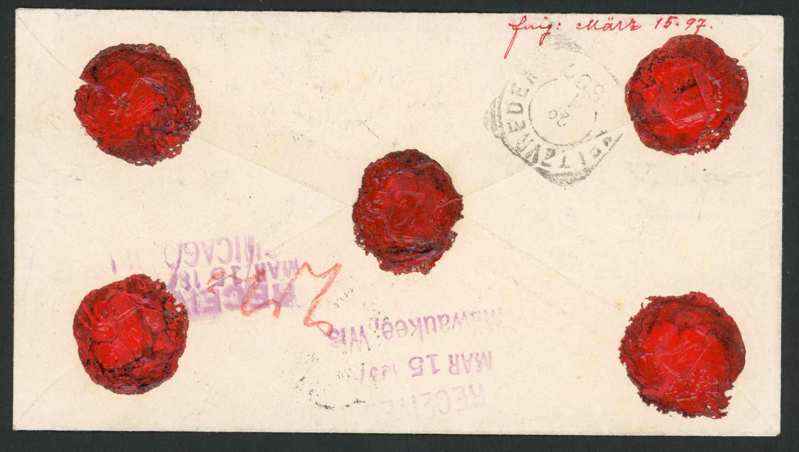 1897, 12½ C. Ganzsachenumschlag mit Zusatzfrankatur 2½ C. Ziffer und 2mal 10 C. Freimarke als Einschreibbrief ab "WESTERCORNELIS 29 1 1897" über London nach Milwaukee/USA, div. Durchgangs- und Ankunftsstempel, attraktiver Beleg (Image) (imagea)