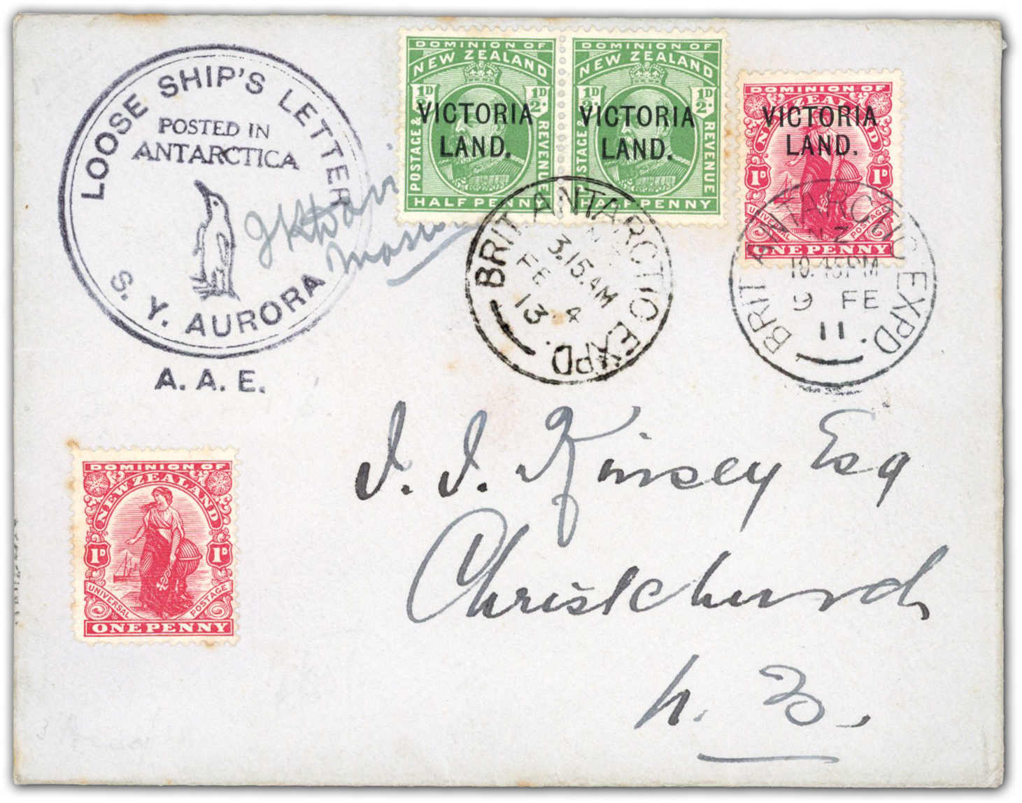 1 P.-Marke) und mit Datum vom 4.2.1913 das Pärchen der ½ P., eine zusätzlich verklebte 1 P.-Marke von Neuseeland blieb unentwertet, adressiert nach Christchurch, nebengesetzt "LOOSE SHIP´S LETTER/POSTED IN ANTARCTICA/S.Y.AURORA" mit Pinguin, Stempel