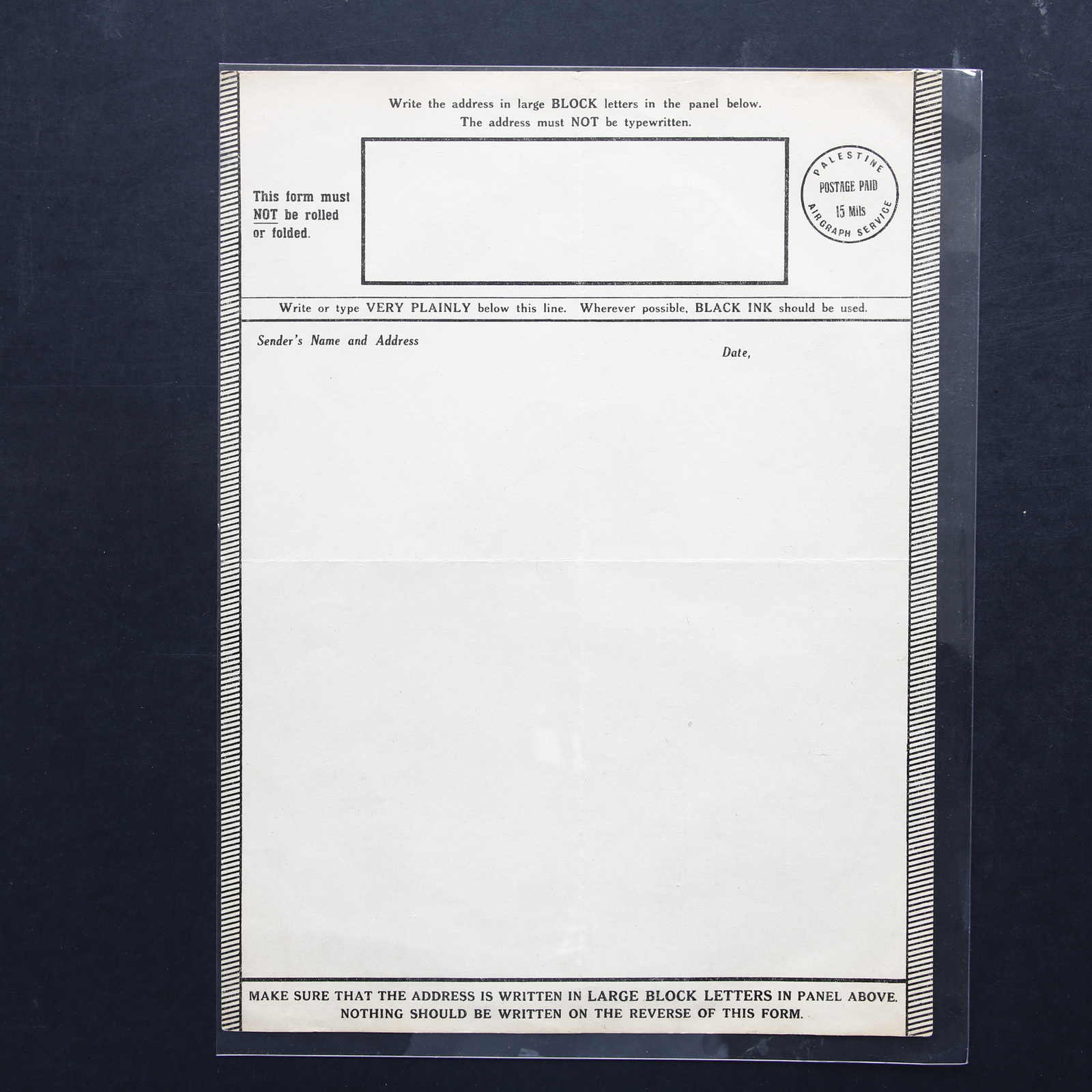 1944 ca., AIRGRAPH-Vordruck ungebraucht mit Eindruck "PALESTINE POSTAGE PAID 15 Mils AIRGRAPH SERVICE", im Bale-Katalog nicht registriert, ein reguläres Ganzsachen-Formular, senkr. und waager. gefaltet, sonst gute Qualität (Image)