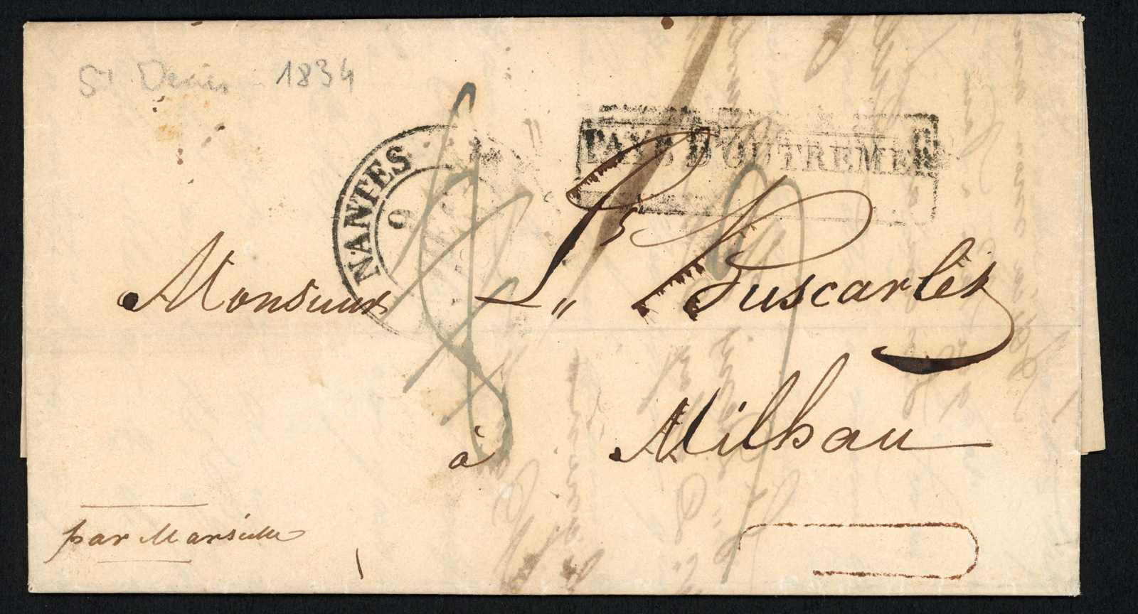 1834, Faltbrief ab St. Denis über Nantes nach Milhau in Frankreich, Ra1 "TAXE D´OUTREMER", gute Bedarfsqualität (Image)