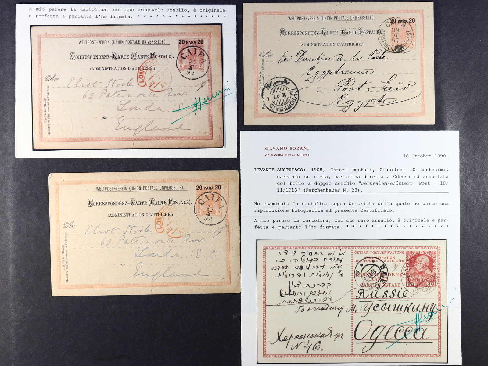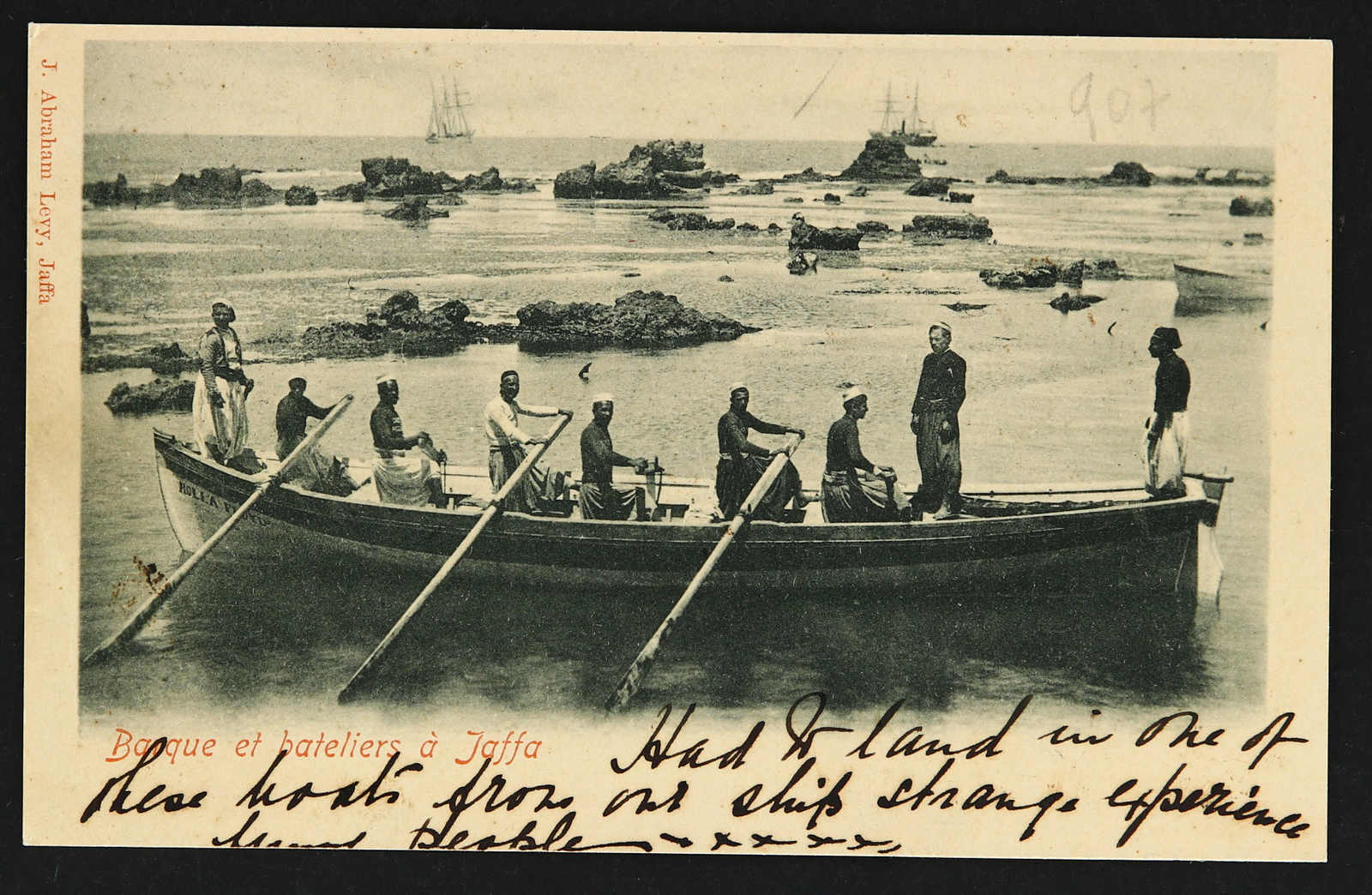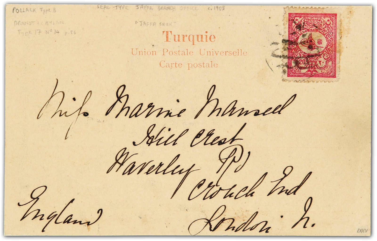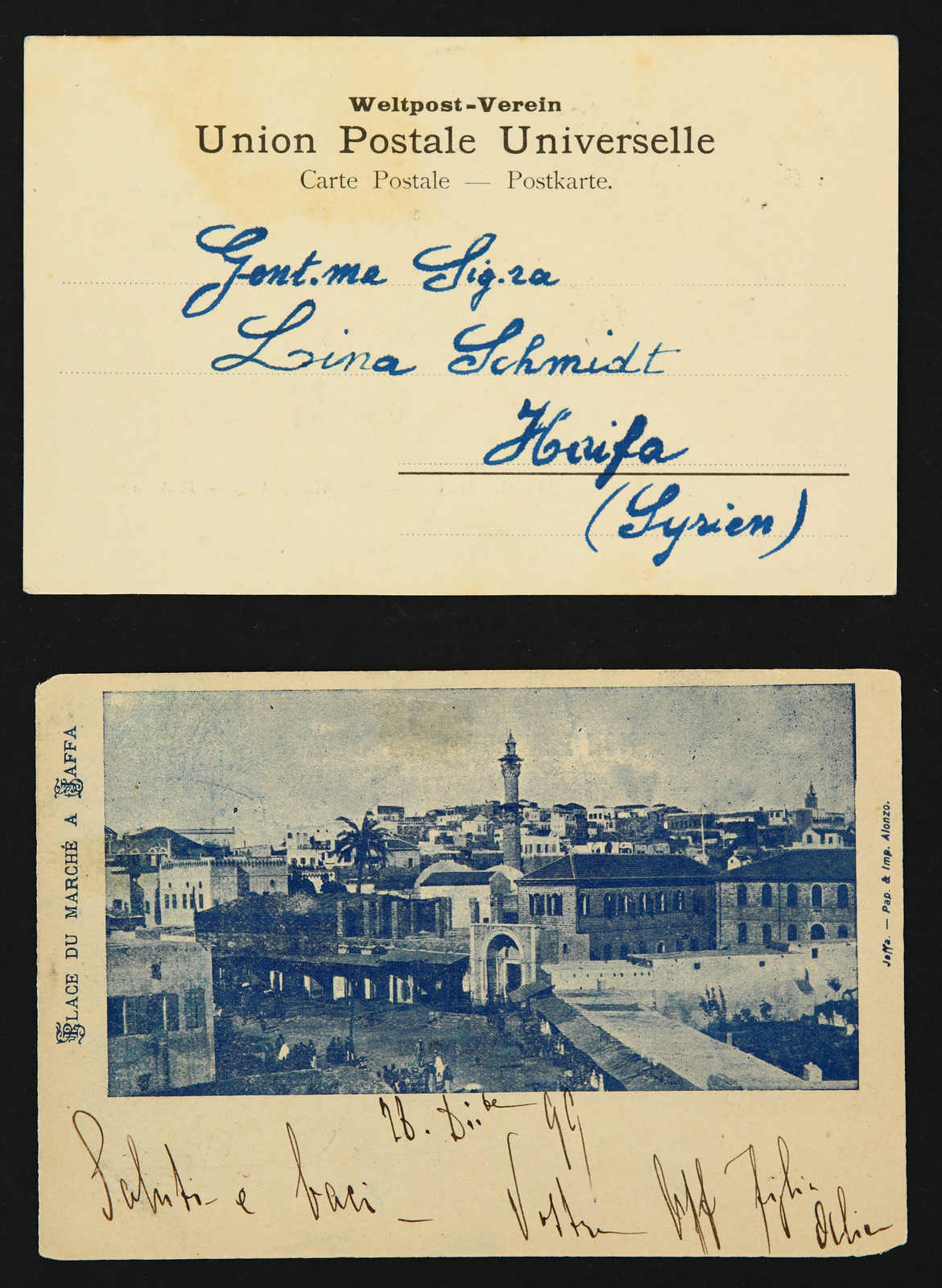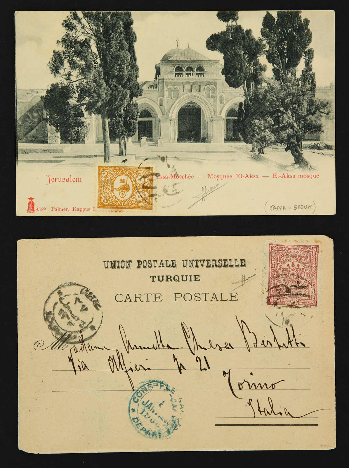 1900/01, two picture postcards sent from Ottoman office showing all Arabic "Jaffa Post Office" postmarks, one of them to Italy the other one sent to Haifa, both signed Sorani (Image) (imagea)