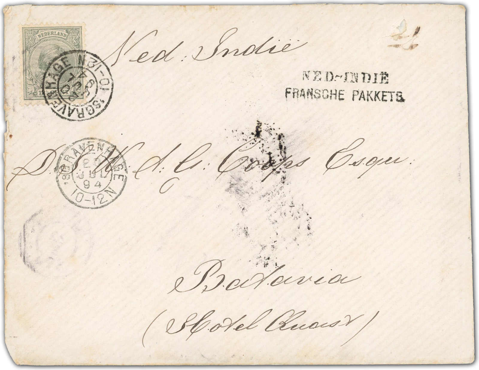 1894, Brief ab Den Haag nach Batavia mit L2 "NED.-INDIE FRANSCHE PAKKETS.", mit französischer Schiffspost befördert, selten, etwas tropisch