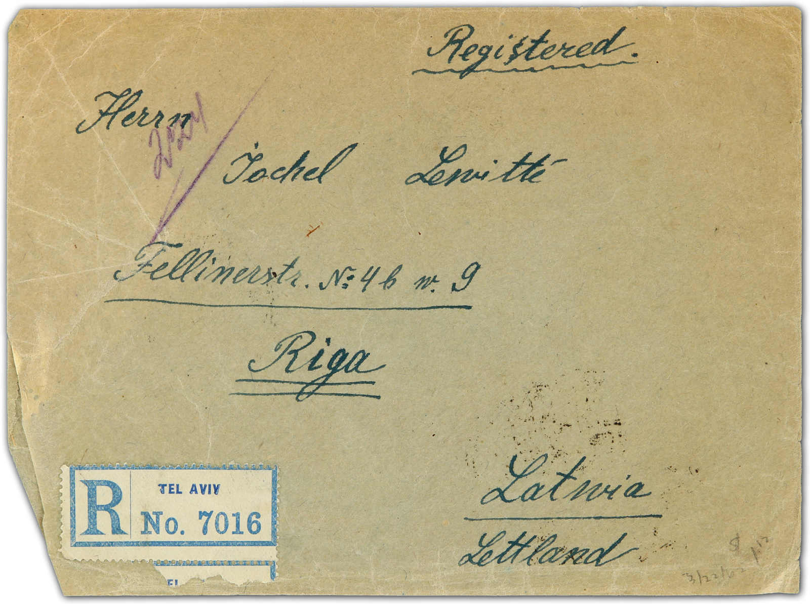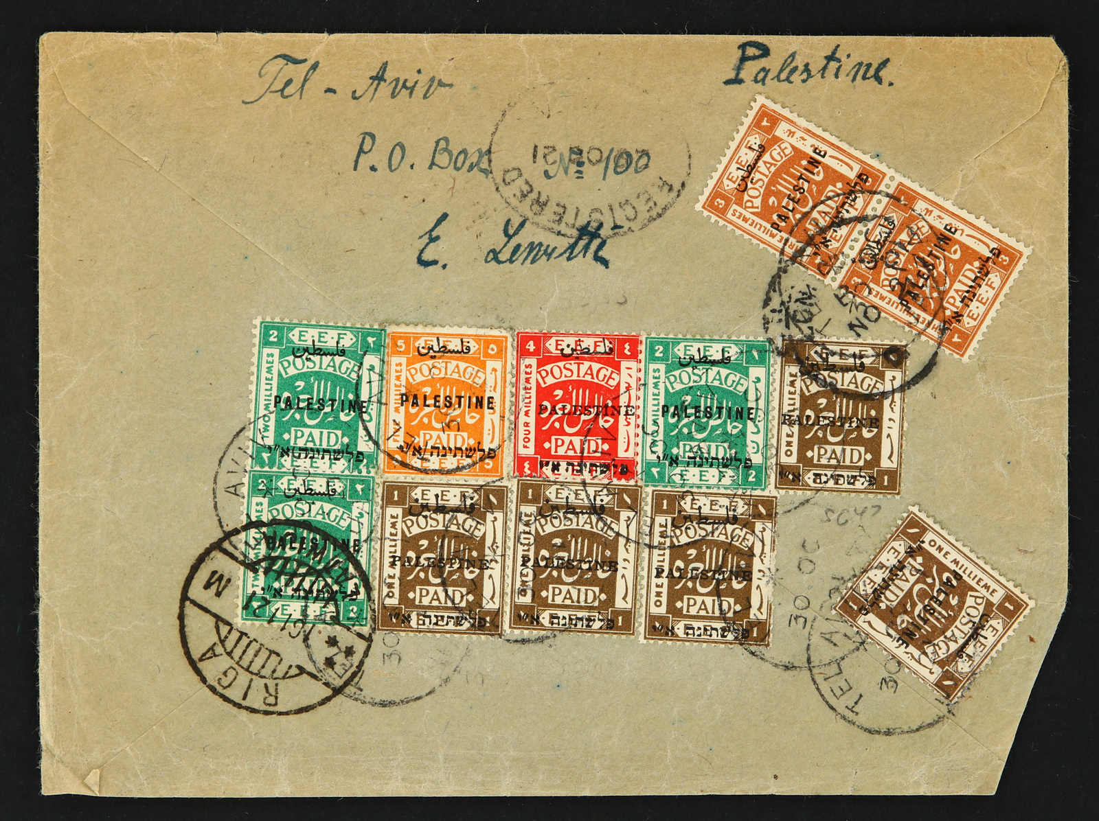 1921, registered multi franking cover sent from Tel Aviv to Riga/Latvia bearing on reverse 5x 1mil., 3x2 mil., pair 3 mil., 4 mil. and 5 mil., all tied by Tel Aviv postmarks, also Riga arrival postmark on stamp (Image) (imagea)