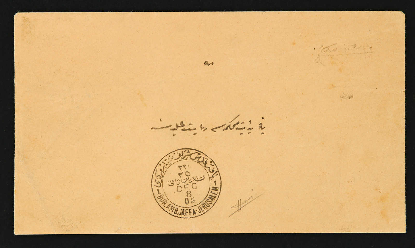 1905, official cover sent from Ramle court to Jaffa court showing extremely clear bilingual "Bur.Amb.Jaffa-Jerusalem" railway post office postmark dated "Dec.8.05", signed Sorani (Image) (imagea)