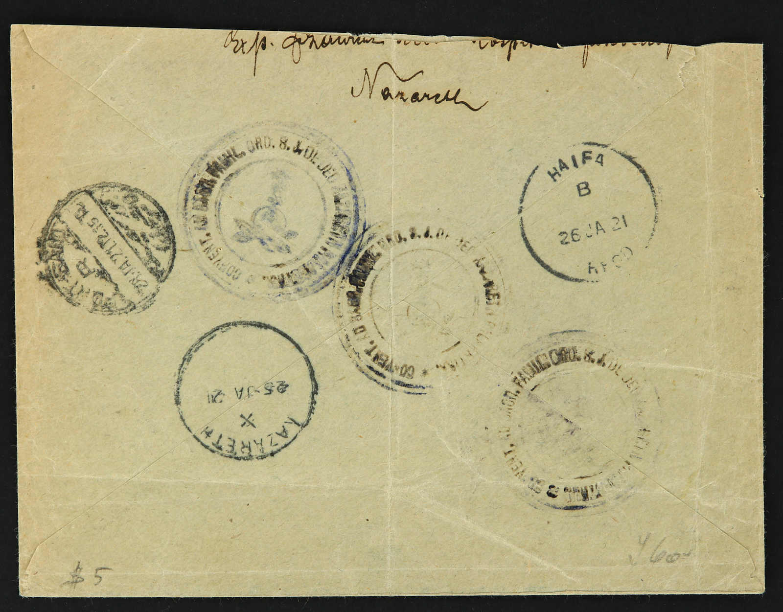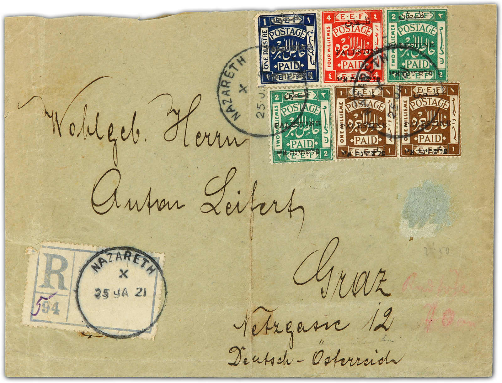 1921, registered colourful franking cover sent from Nazareth to Graz/Austria bearing pair 1 mil., 2x2mil., 4 mil. and 1 piastre tied by circular "Nazareth 23 Ja.21" postmarks, on reverse several transit cds (Image) (imagea)