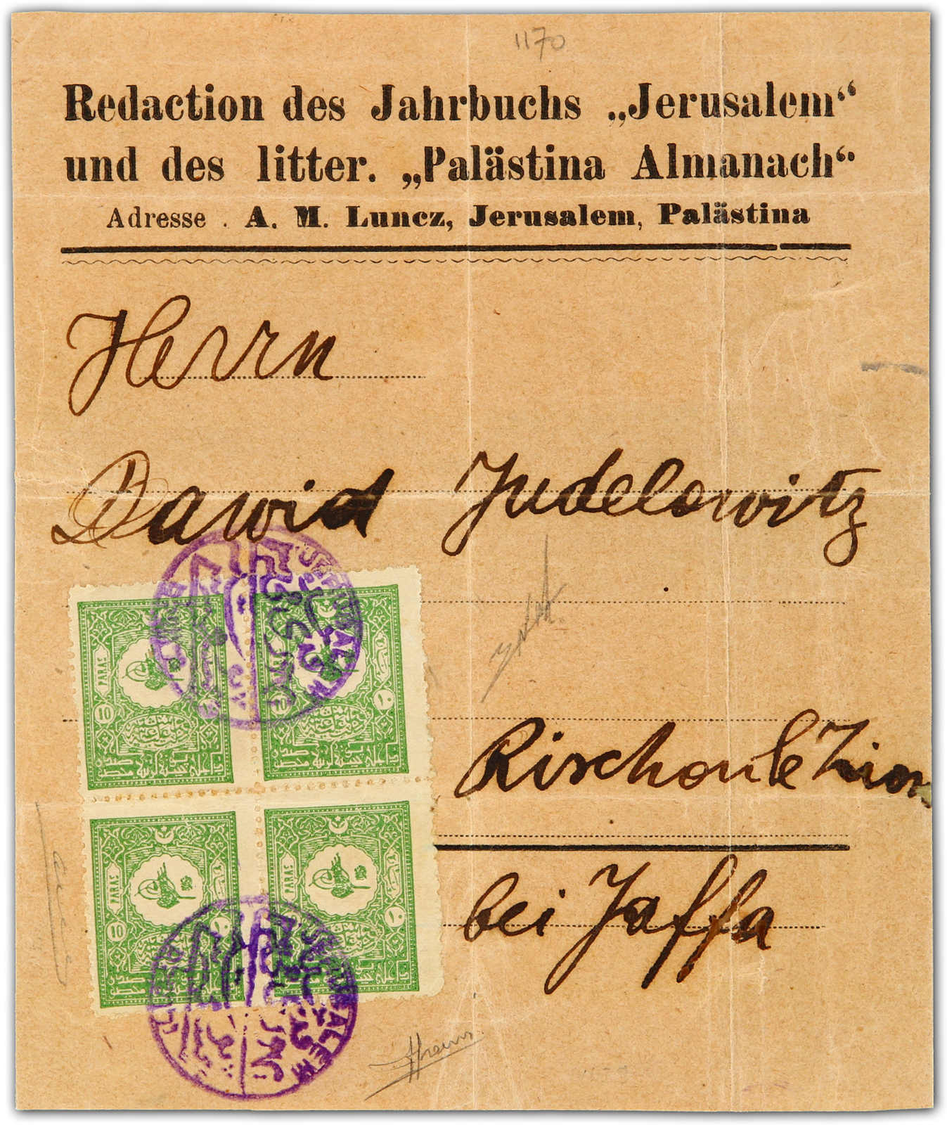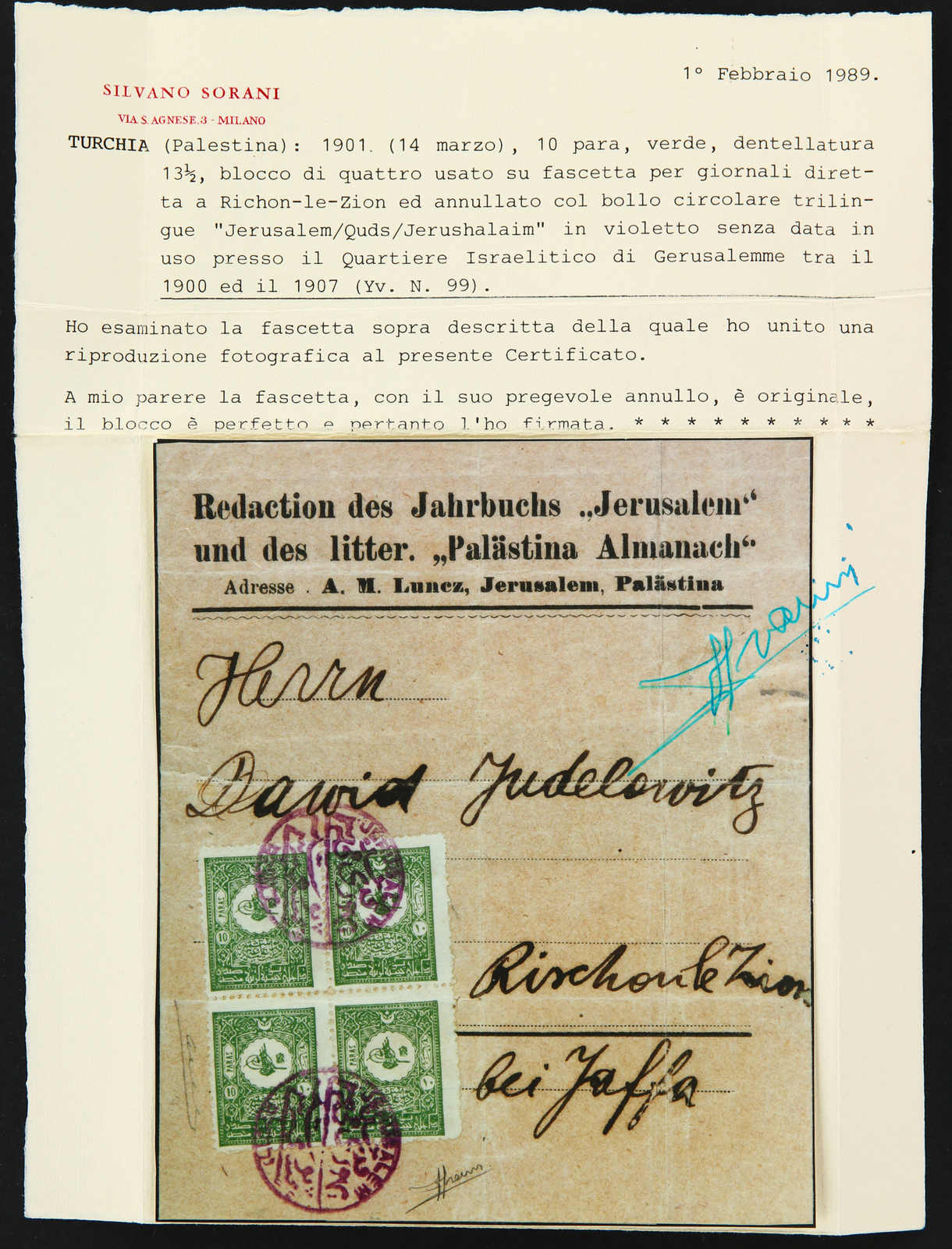 1901, newspaper wrapper bearing block of four 1901 internal postage stamp tied by trilingual Jerusalem Jewish Quarter blue postmark sent to Jewish colony Richon-le-Zion, cert. Sorani, signed Nakri (Image) (imagea)