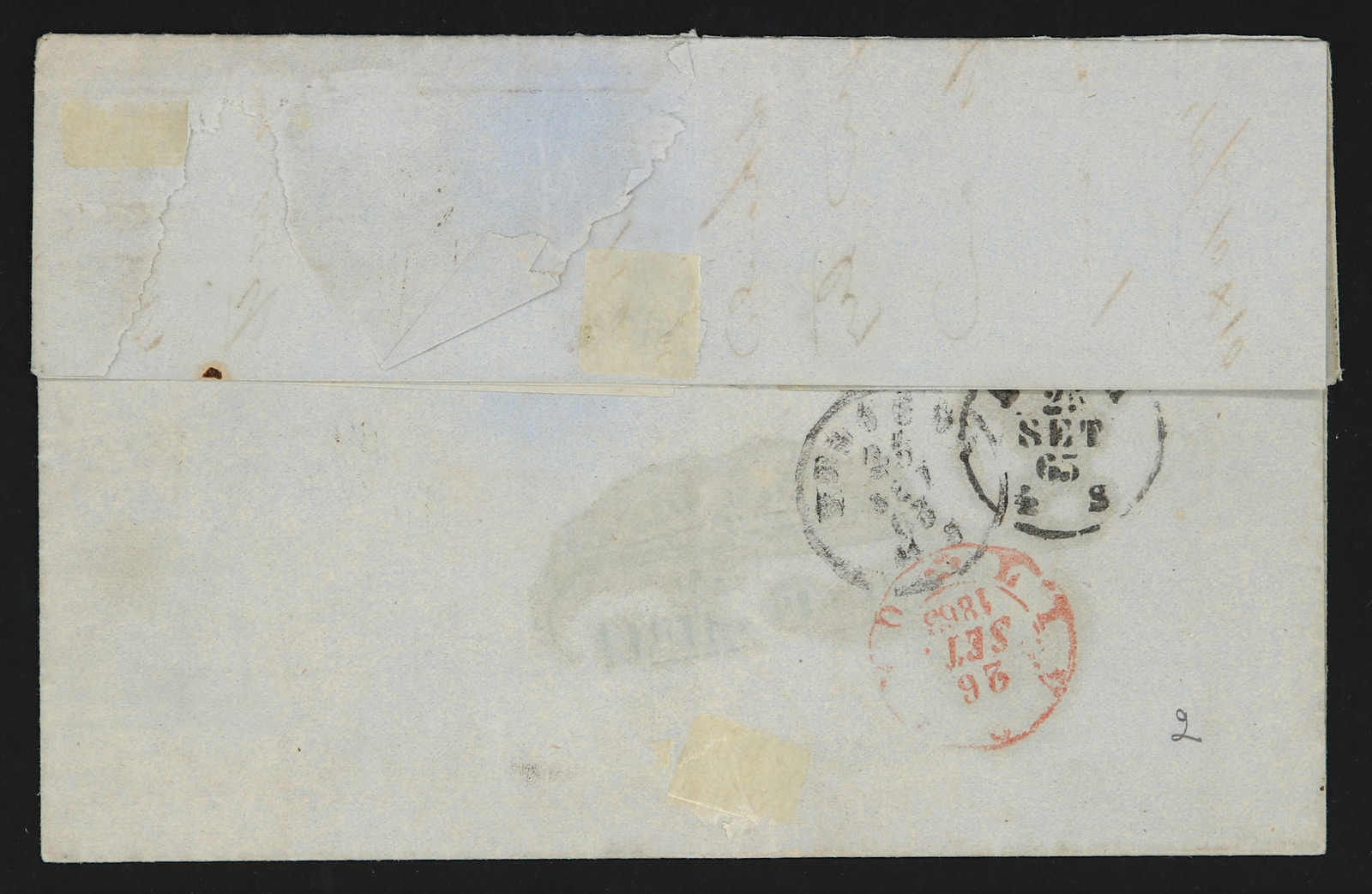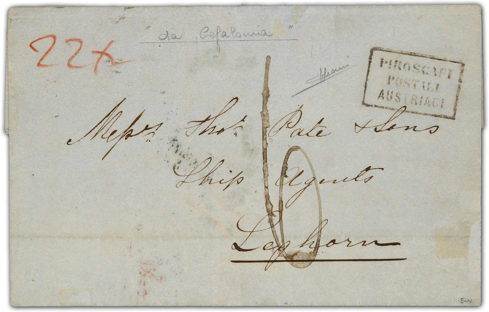 Corfu, 1863, entire letter from Cephalonia to Leghorn/Livorno/Italy showing very clear rectangle "PIROSCAFI POSTALE AUSTRIACI" shipping service cachet, on reverse several transit and arrival cds, signed Sorani (Image) (imagea)