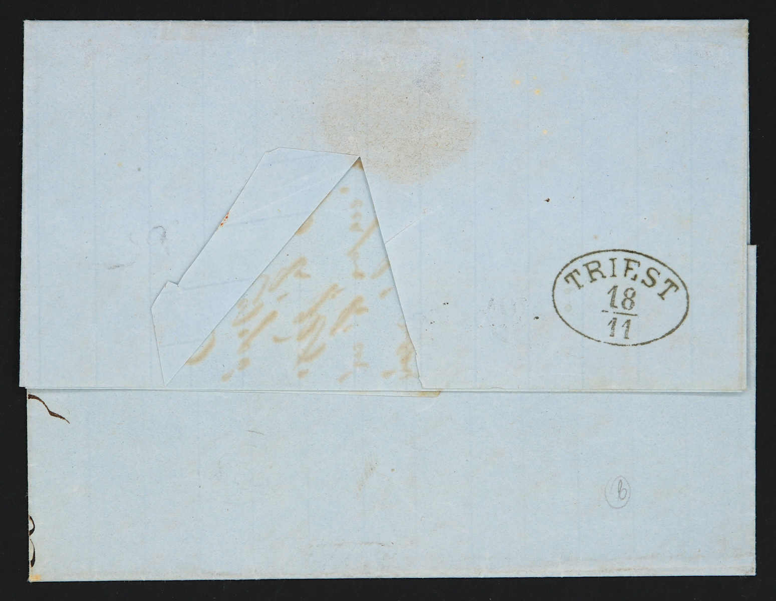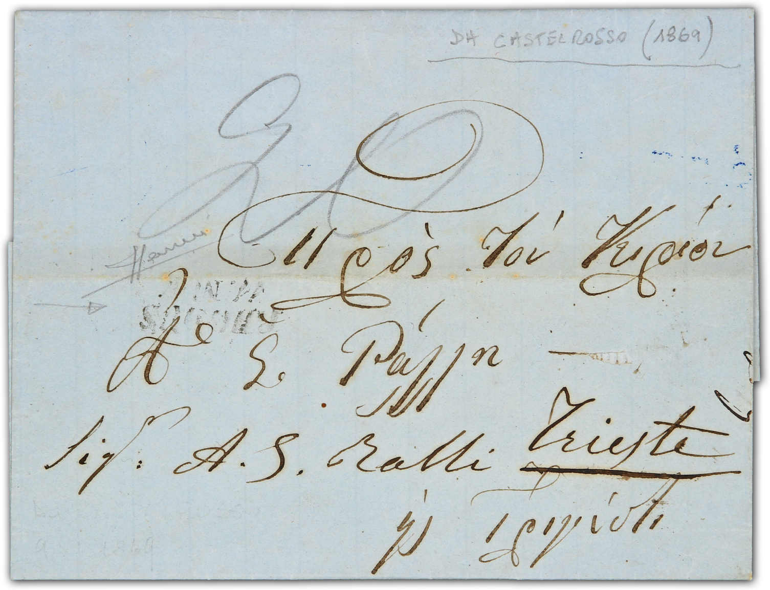 Austrian Levant Castelrosso office: 1869, entire letter sent from Castelrosso via Rhodes to Trieste showing double straight lines "RHODES 11 MAY" postmark, on reverse oval arrival cds, signed Sorani (Image) (imagea)