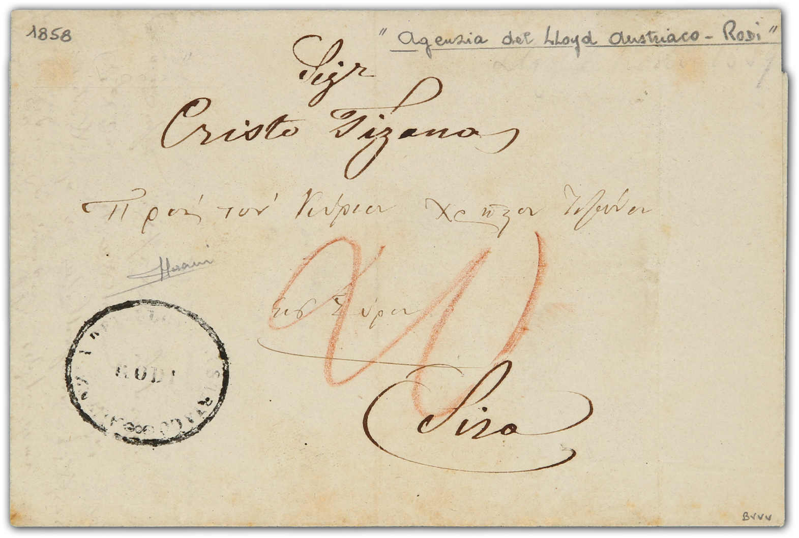 Austrian Levant Rhodes office: 1858, entire letter sent from Rhodes to Sira/Greece showing oval "AGENZIA DEL LLOYD AUSTRIACO RODI" postmark, on reverse arrival cds, signed Sorani (Image) (imagea)