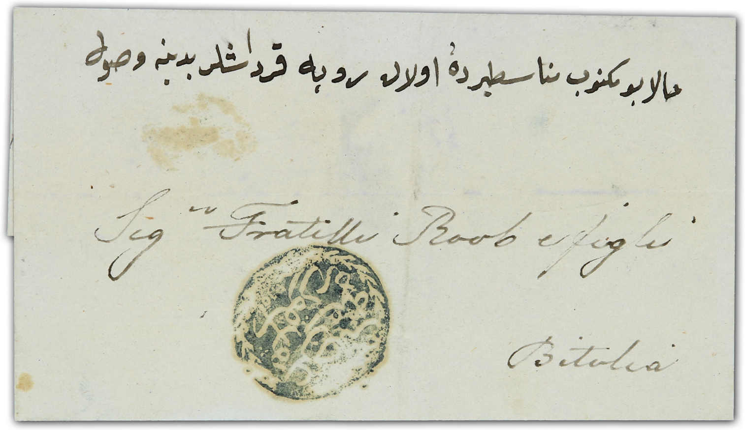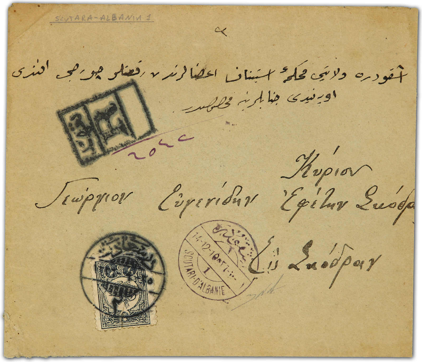 Shkodër-İşkodra: prephilatelic period, entire letter from Scutari to Manastir/Bitolia showing superb strike of all arabic negative "An-Canib Posta-i İşkodra 265" (="in behalf of Shkoder post Office") handstamp in black (Coles & Walker
