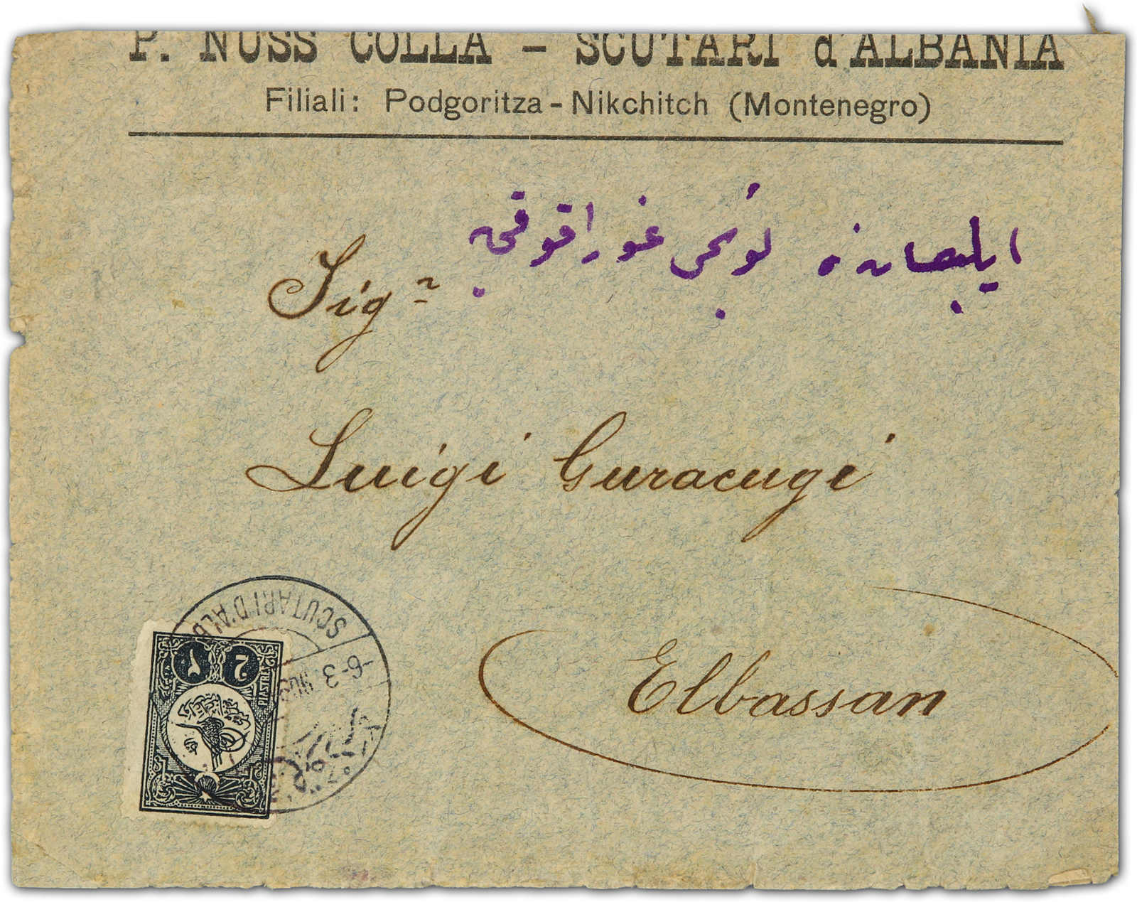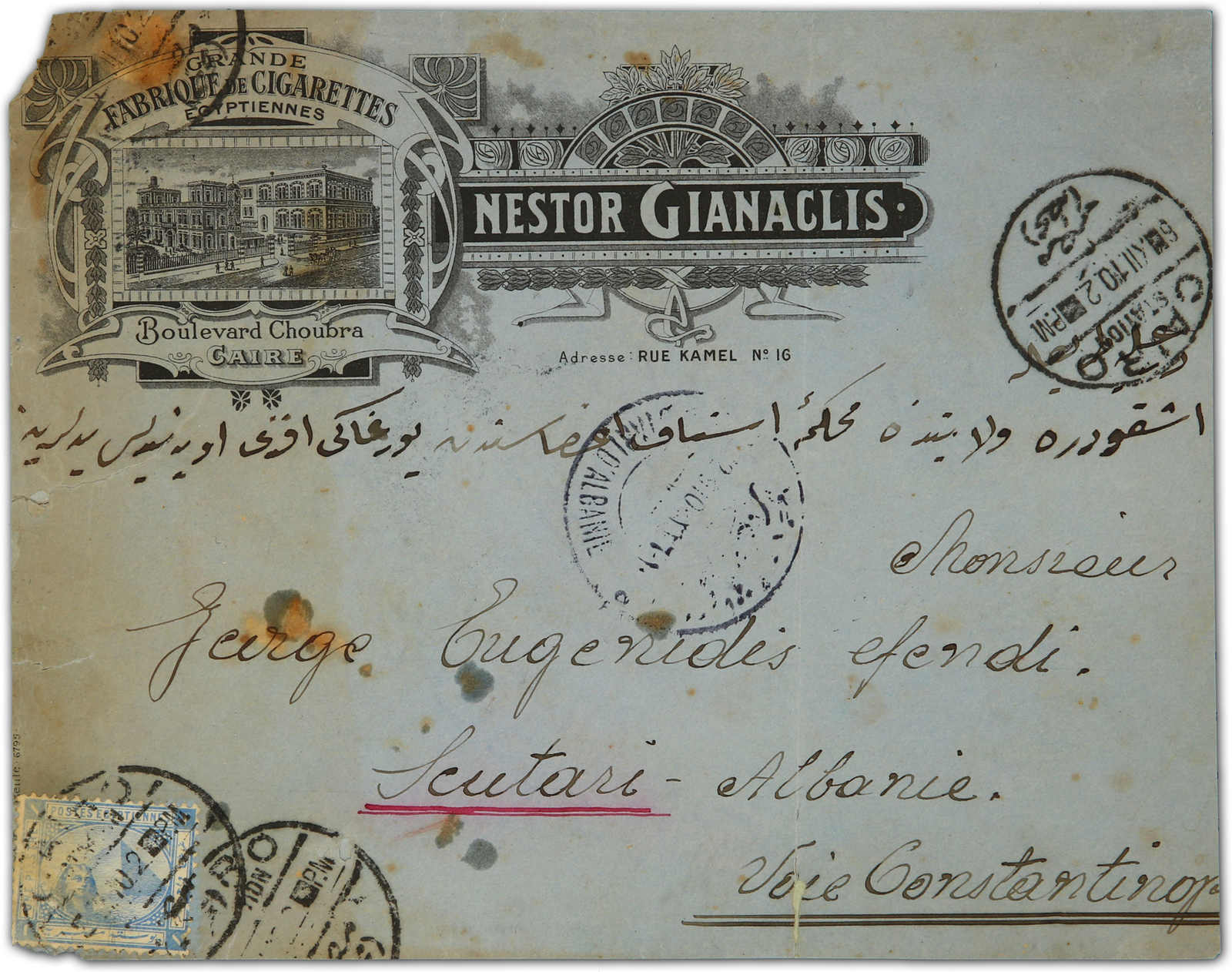 Shkodër-İşkodra: 1910, single franking cigarette factory advertisement cover sent from Cairo/Egypt to Scutari-Albania via Constantinople bearing 1 piastre blue tied by Cairo cds, alongside large size bilingual "SCUTARI D'ALBANIA" arrival