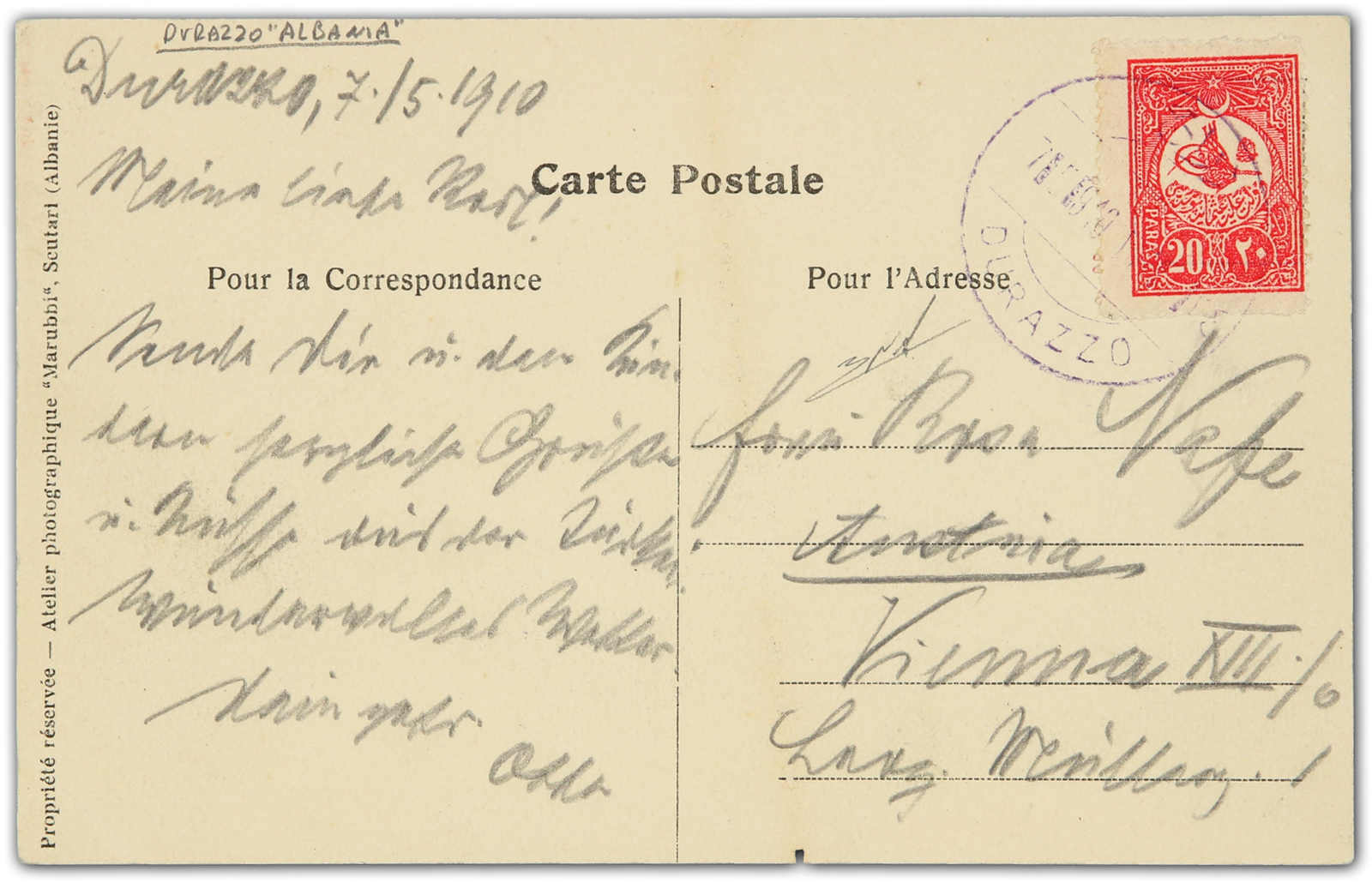 Durres-Durazzo: 1910, picture postcard of Durazzo used from Draç to Vienna bearing 1908 issue 20 para rose-red, tied by bilingual "DURAZZO" in blue ink (Coles & Walker fig. 9). (Image) (imagea)