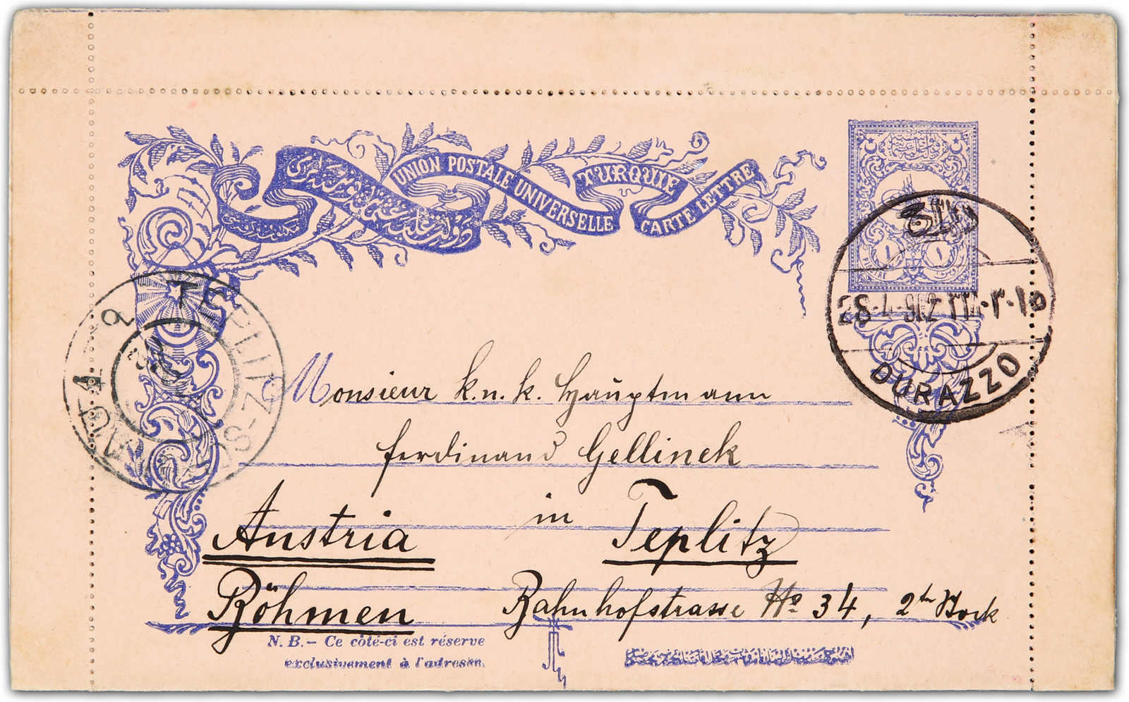 Durres-Durazzo: 1901, issue letter-card of 1 piastre used from Durres to Austria showing very fine bilingual "DURAZZO" cds (Coles & Walker fig. 9).