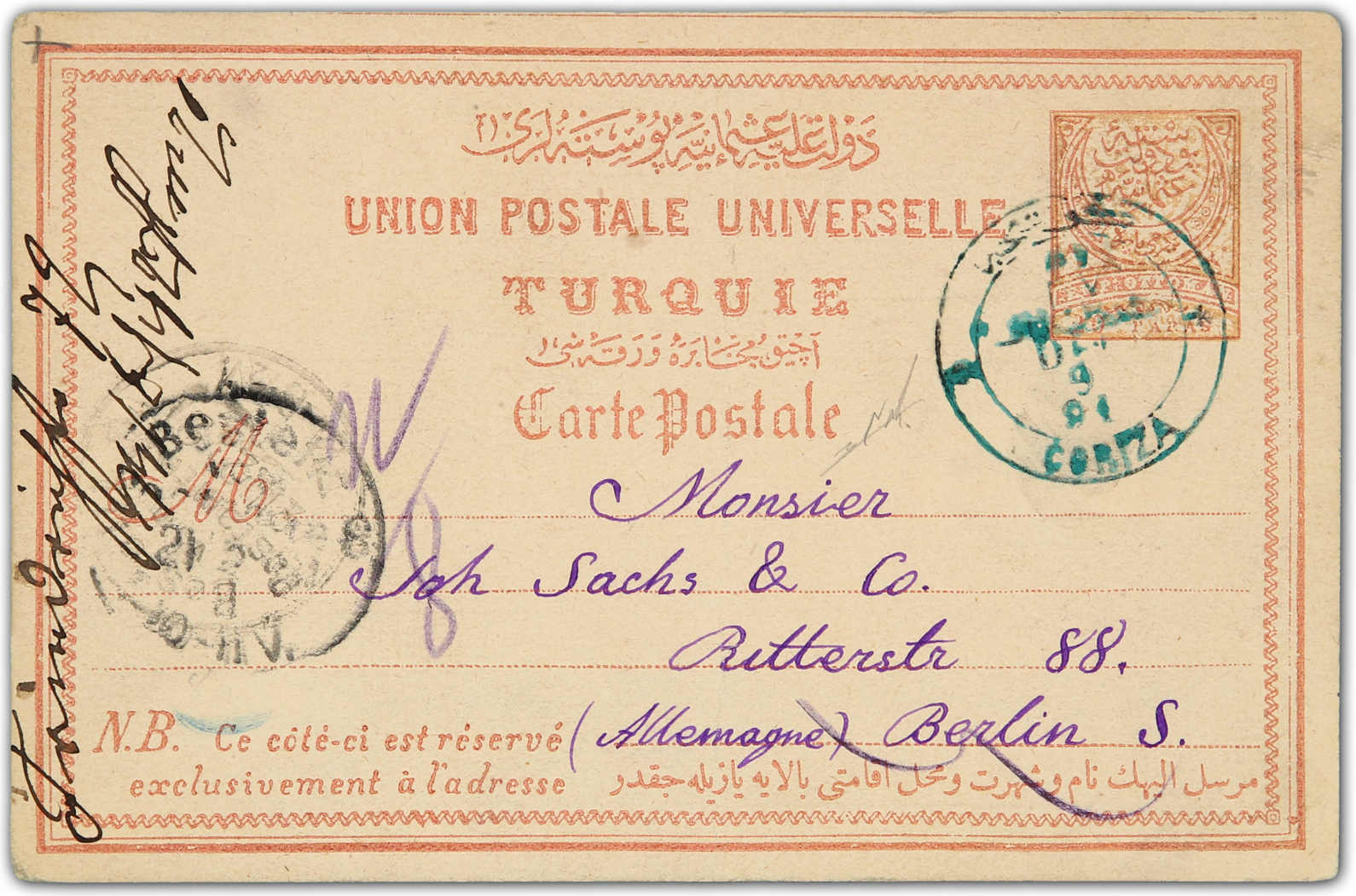 Korçë-Coritza: 1884/91, 20 pa. rose on buff postal stationery card used in 1891 from Coritza to Berlin showing extremely clear bilingual "CORIZA" circular date stamp (Coles & Walker fig. 66), well struck in greenish blue, with date
