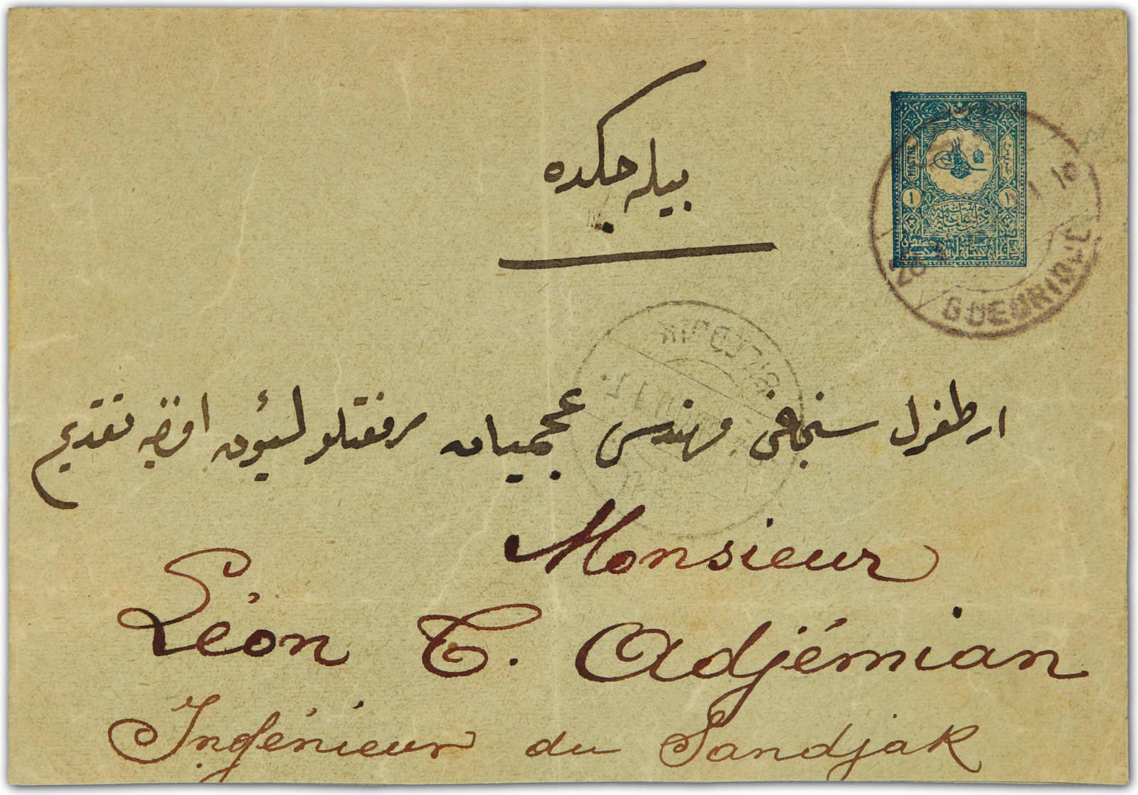 Korçë-Coritza: 1905 stationery letter envelope of 1 piastre sent from Korçe to Bilecik showing fine bilingual "GUEURIDJÉ" circular date stamp, alongside bilingual Biledjik arrival cds, Coles & Walker fig. 50 (Image) (imagea)