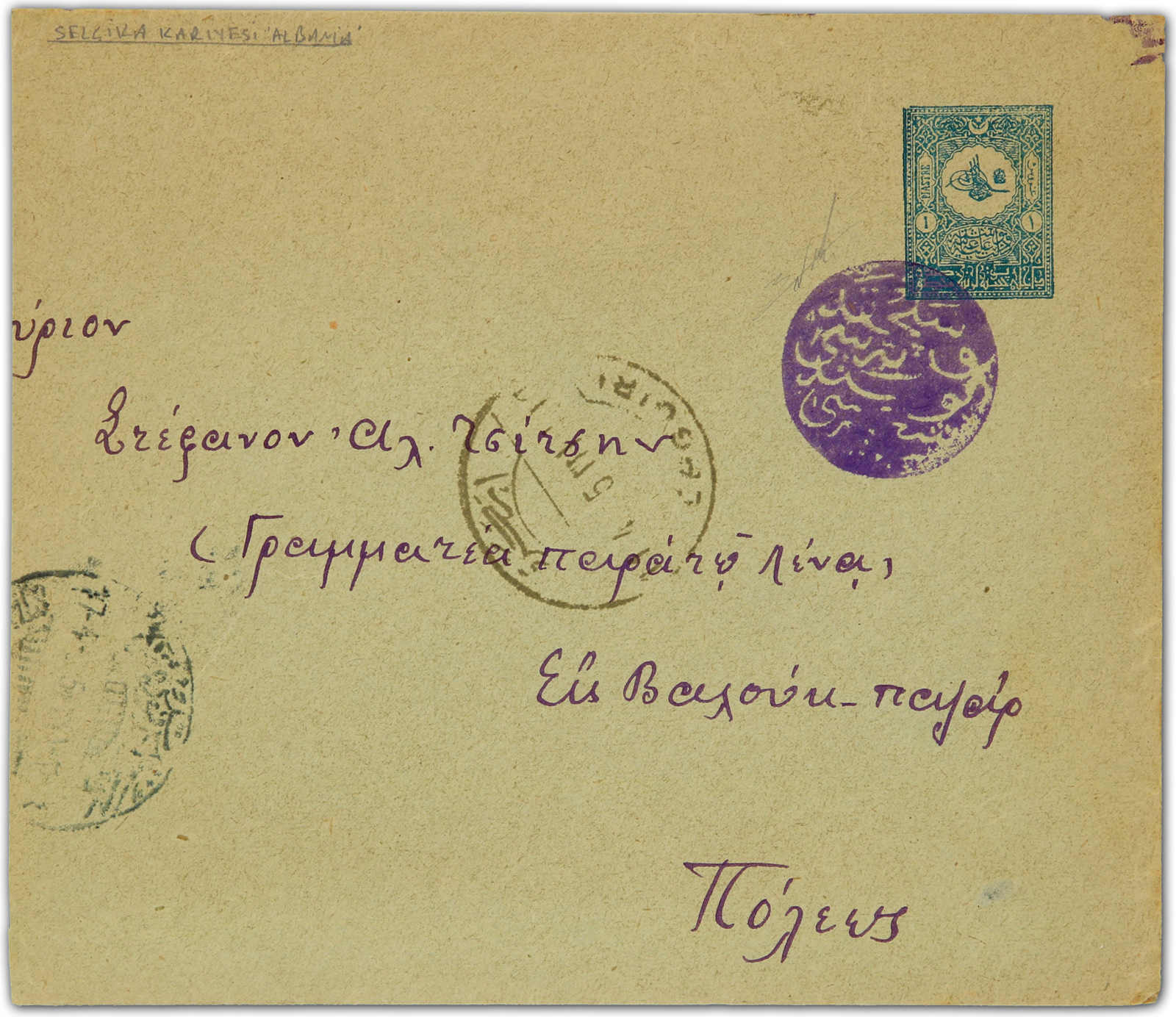 Selckë-Selçika karyesi: 1901, 1 pi. blue on green postal stationery envelope used to Constantinople showing all Arabic circular negative "Selçika Karyesi Posta Şubesi" (= "Selçika Village Post Office") handstamp in violet (Coles & Walker