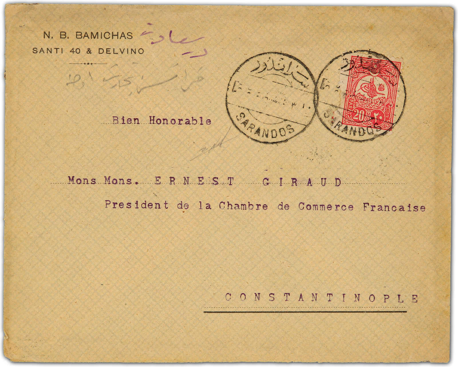Sarandë-Santi Quaranta: cover sent from Sarandos to Constantinople bearing single franking 1908 issue 20 para stamp tied by bilingual "SARANDOS" postmark, on reverse arrival cds, Coles & Walker fig. 36, signed Nakri (Image) (imagea)