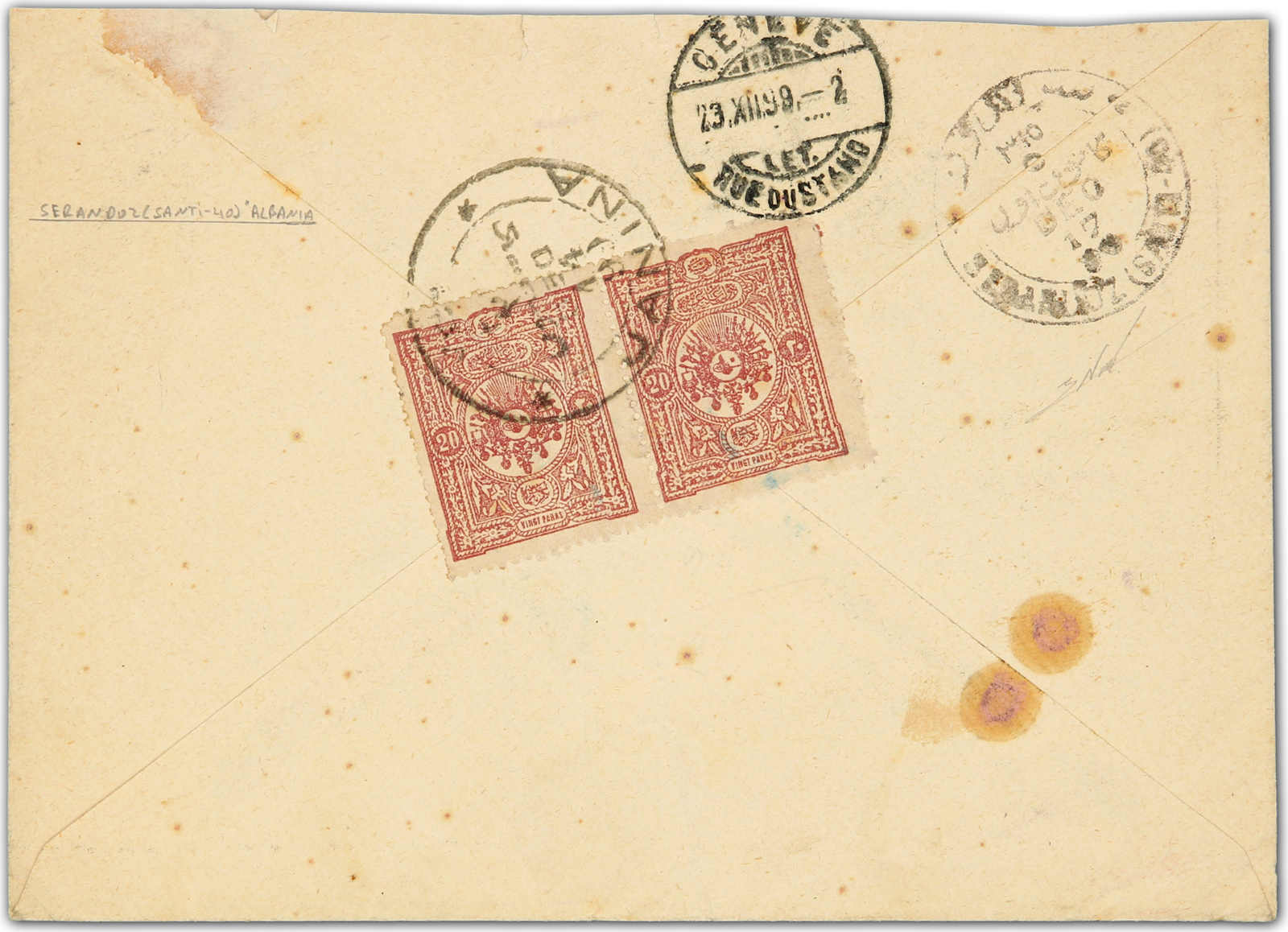 Sarandë-Santi Quaranta: 1899, cover sent from Janina to Geneve/Switzerland via Santi Quaranta post office bearing on reverse 1892 issue 20 pa. pair tied by bilingual "JANINA" postmark, alongside showing very rare bilingual with stars type