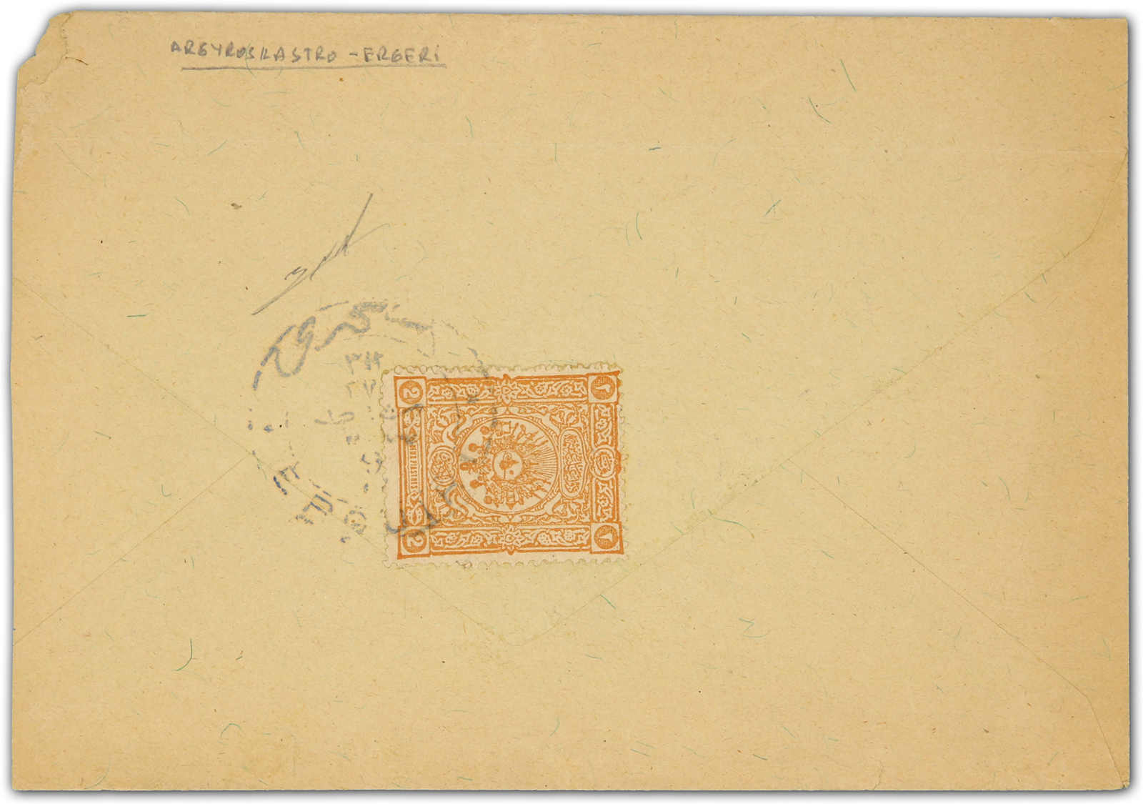 Argyrokastron - Erguiri: 1892, single franking cover sent from Ergeri bearing on reverse 1892 issue 2 piastre brownish yellow tied by bilingual "ERGUIRE" cds, Bayindir fig. 5. (Image) (imagea)
