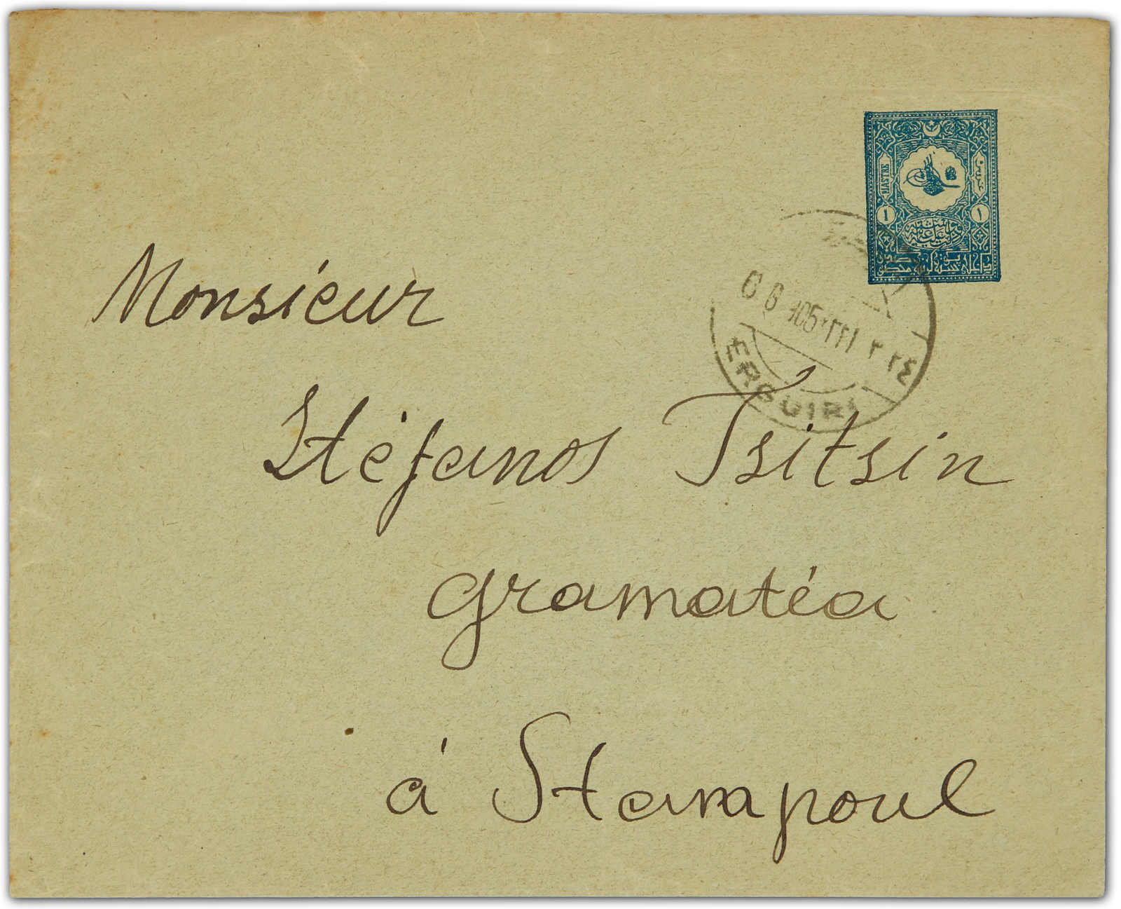 Argyrokastron - Erguiri: 1901, stationery envelope of 1 piastre used in 1905 from Ergeri to Constantinople showing bilingual "ERGUIRI" postmark, on reverse arrival cds, Coles & Walker fig. 16 (Image) (imagea)