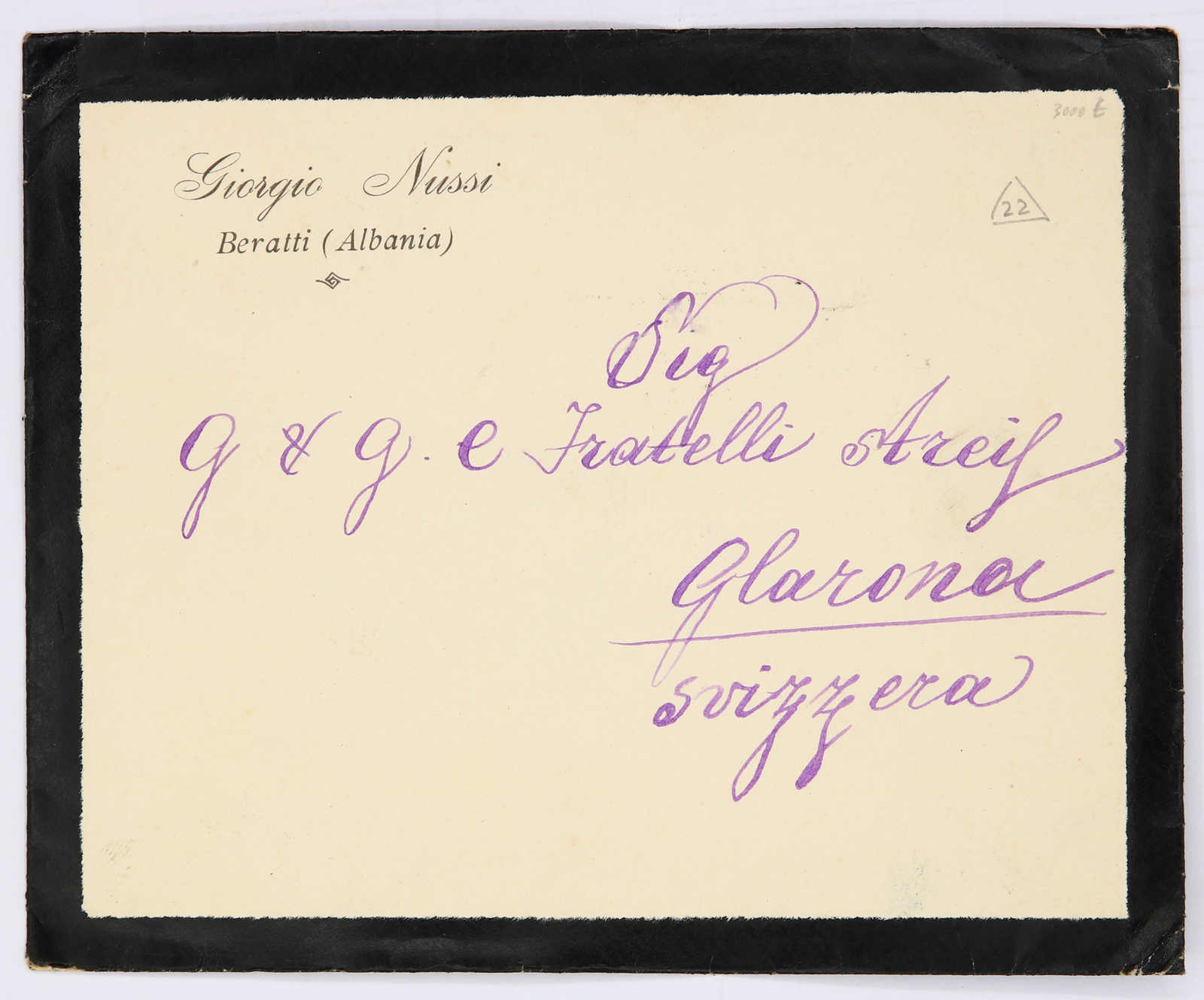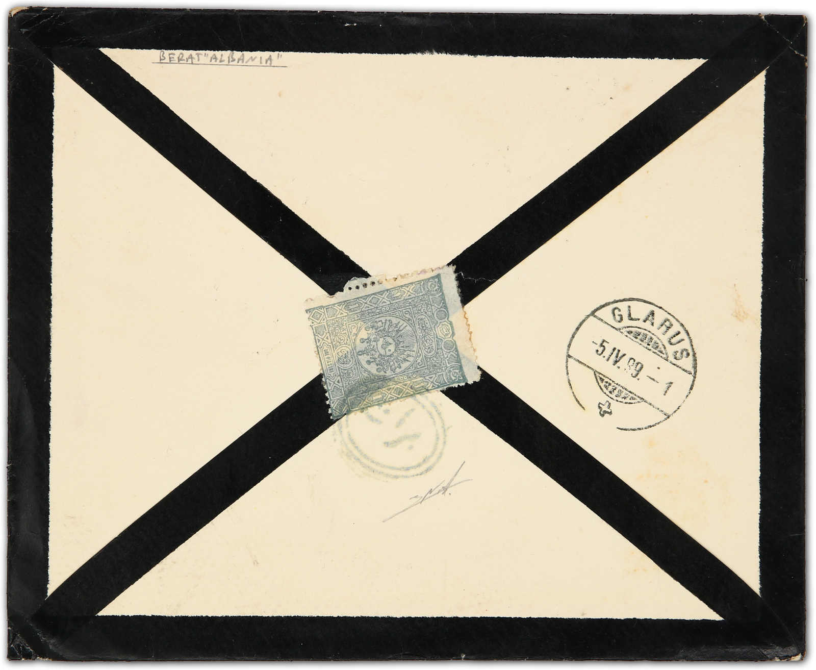 Berat: 1899, mourning cover sent from Berat to Switzerland bearing on reverse single franking 1892 issue 1 piastre tied by extremely rare all Arabic triple-Oval "BERAT" postmark, alongside Glarus arrival cds, Coles & Walker fig. 18,