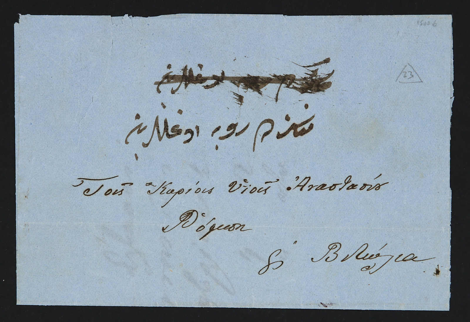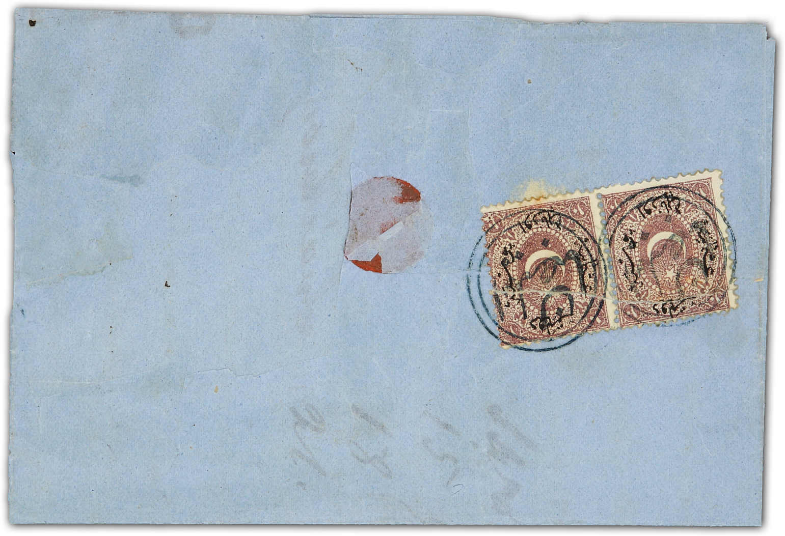 Elbasan-Elbasani: 1868, folded letter sent from Elbasan to Bitola/Manastir bearing on reverse Duloz 1868 issue 10 paras pair (stamps with tear) tied by all Arabic double-circle "ELBASAN" postmarks, Coles & Walker fig. 44 (Image) (imagea)