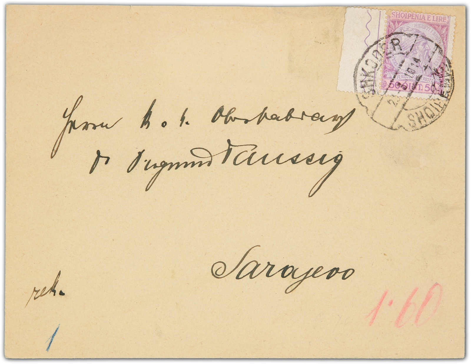5044 Brief Michel:33 image1914, cover sent from Shkoder to Sarajevo/Bosnia bearing single franking of Skanderbeg issue 50 qi, tied by 'Shkoder/Shoipenie' cds (Image)